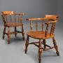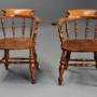 A pair of mid 19th century (circa 1870) birch smokers bow Windsor or Captain’s chairs of superb patina.These chairs each consist of a deep, shaped back support leading down to broad arms, similar to those found on a broad-armed Windsor chair, leading down to eight turned spindle supports joining the arms to the seat.