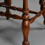 This leads down to a deep, dished birch seat supported by turned legs with vase-shaped feet, the legs supported by double H-form turned stretchers.