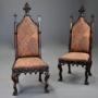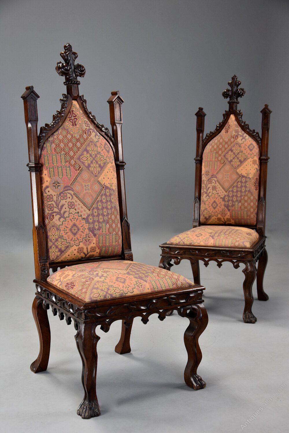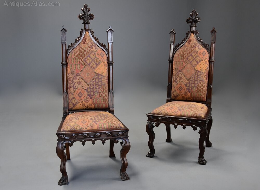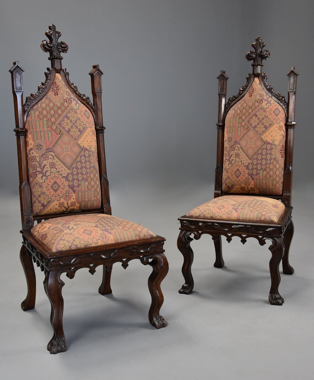 An extremely rare pair of Channel Islands mid 19th century (circa 1850) rosewood Gothic Revival hall chairs with 'W.A. WILLCOCKS’ makers label.This pair of chairs consist of carved foliate poppy head finial to the centre with typical Gothic lancet arch shaped back with foliate carved decoration, the uprights chamfered with moulded collar and the lower back rail with dentil carved design.