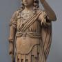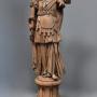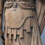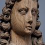 A large highly decorative 18th century Continental life size carved oak figure possibly of the Greek God of Medicine, Asclepius.This figure consists of a life size carved oak figure (possibly originally polychromed), his long curly hair resting on his shoulders, his left arm raised with a serpent or snake entwined around his right hand. He is dressed in a chiton (or tunic) and himation or chlamys (cloak) supported on circular carved base on moulded square plinth.