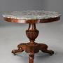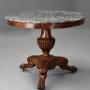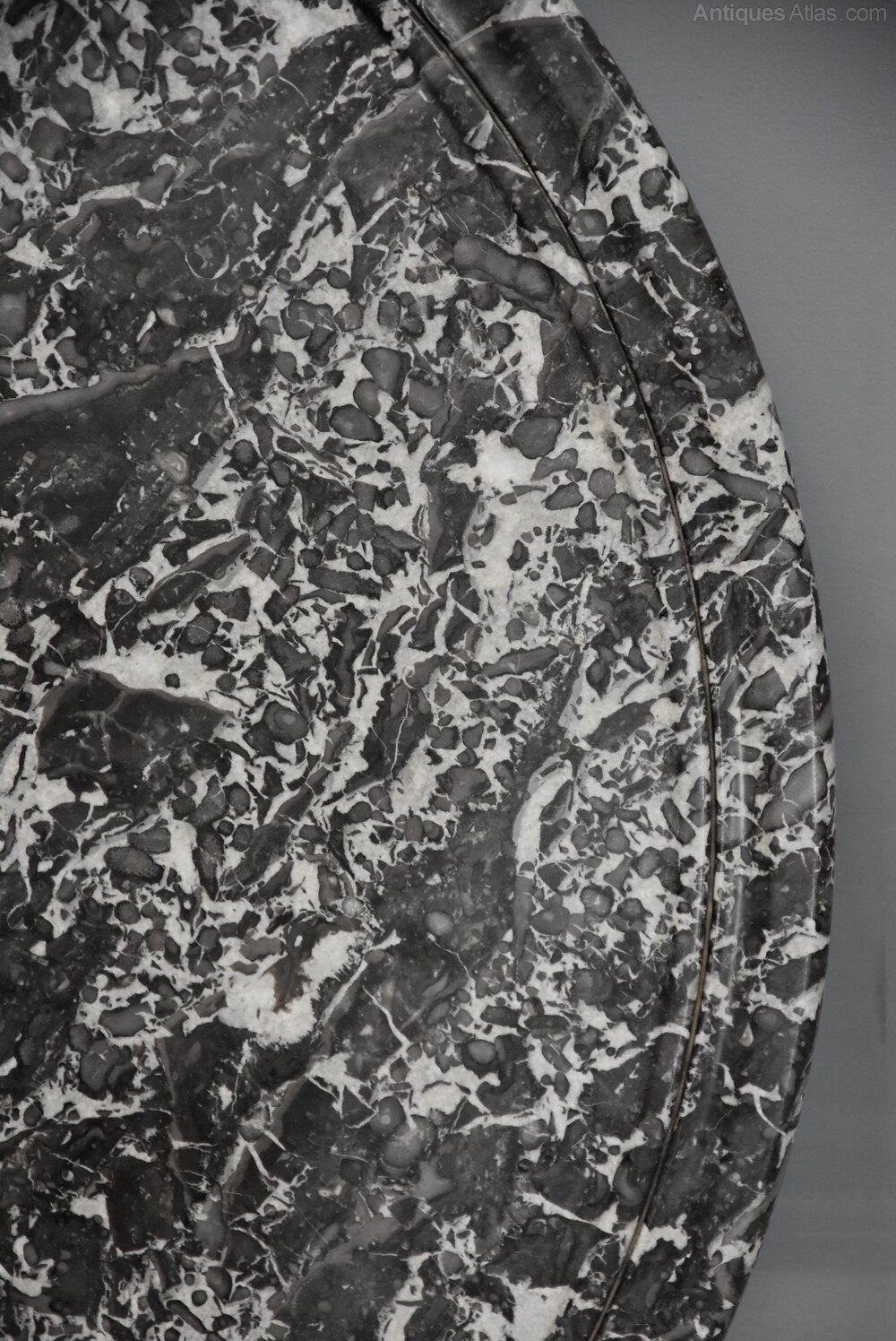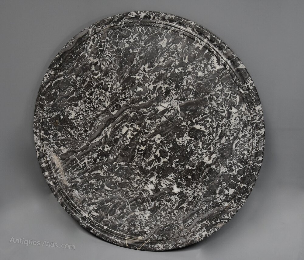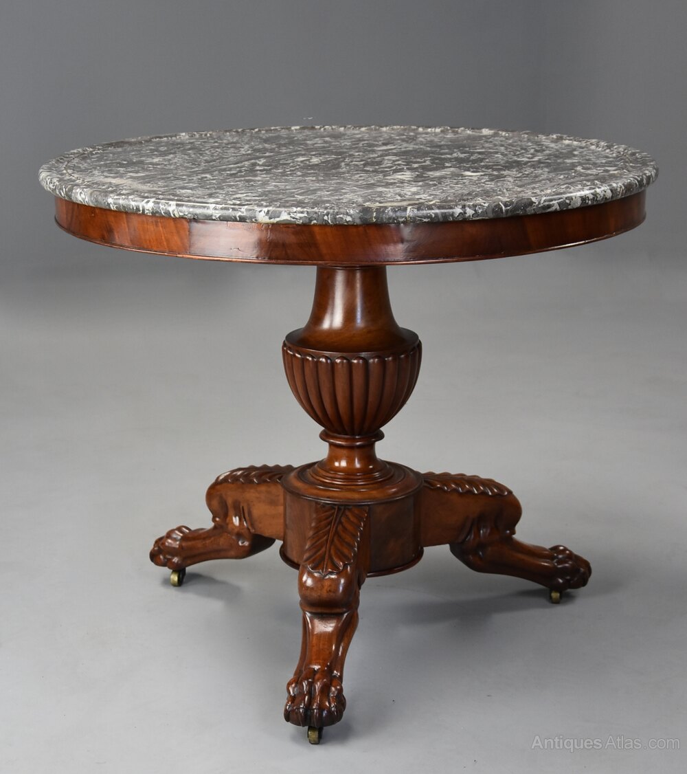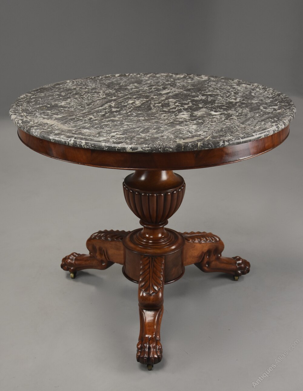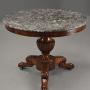 A fine quality 19th century (circa 1830) French mahogany Gueridon table with original black and white veined marble top, possibly Gris Sainte Anne.This table consists of an original marble top of black and white veined marble, possibly Gris Sainte Anne, with a moulded outer edge supported by a figured mahogany frieze and moulded edge below.