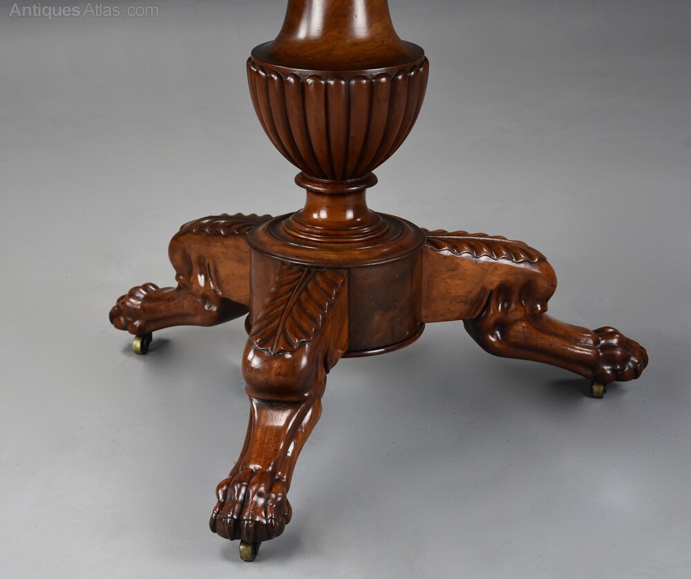 This leads down to a turned and finely carved baluster column with gadroon carved decoration supported by a tri-form base finely carved in the typical French Empire style consisting of three superbly carved legs with foliate carved decoration, terminating with carved paw feet and brass castors.