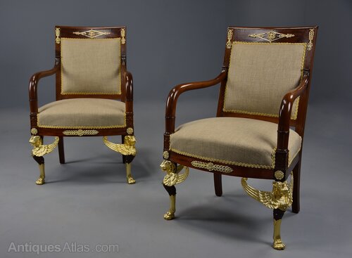 A pair of highly decorative late 19th century (circa 1890) French mahogany armchairs or fauteuils in the Empire style with ormolu mounts.This pair of armchairs each consist of a shaped top rail with central ormolu mount with mask design and ormolu mounts to either side.
