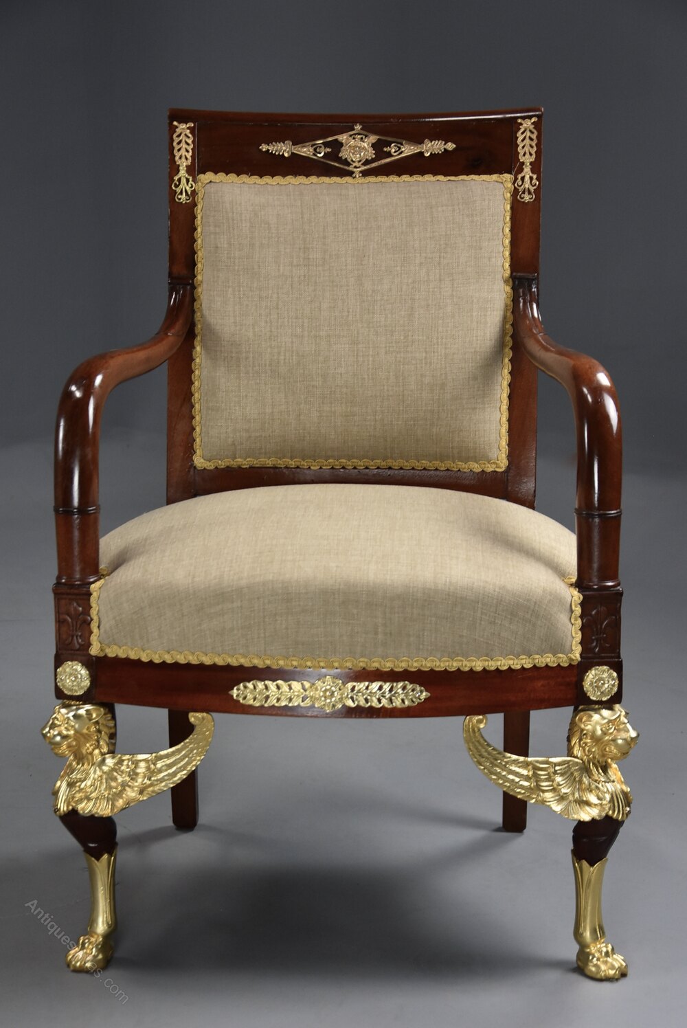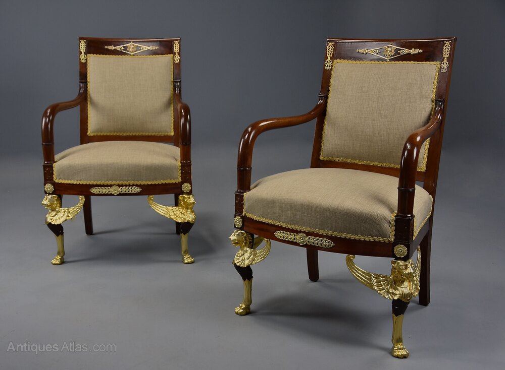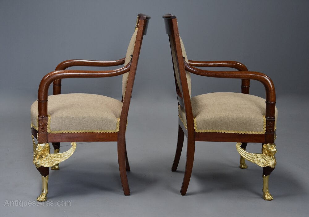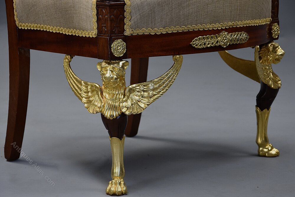 The chairs are supported on ormolu monopodia legs to the front of winged lion heads with paw feet and outswept legs to the back, the chair having a recessed and upholstered panel to the back.