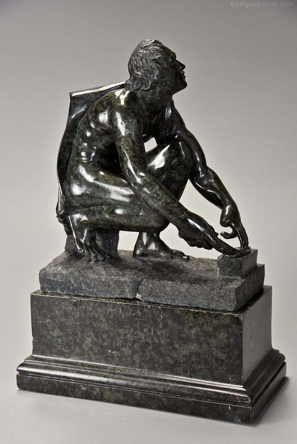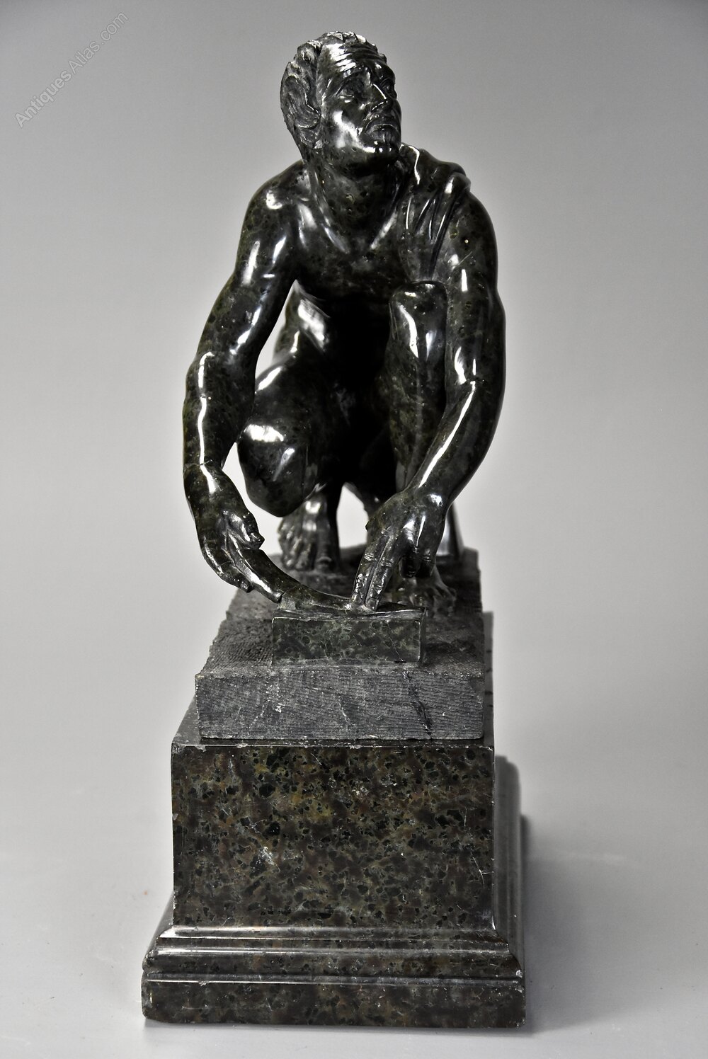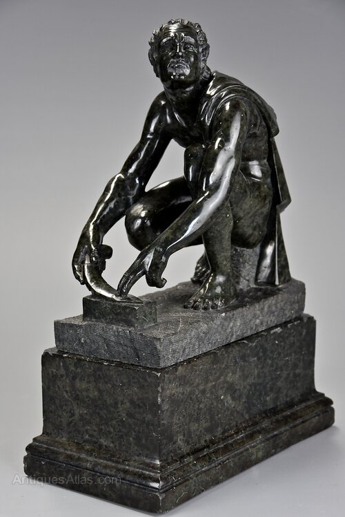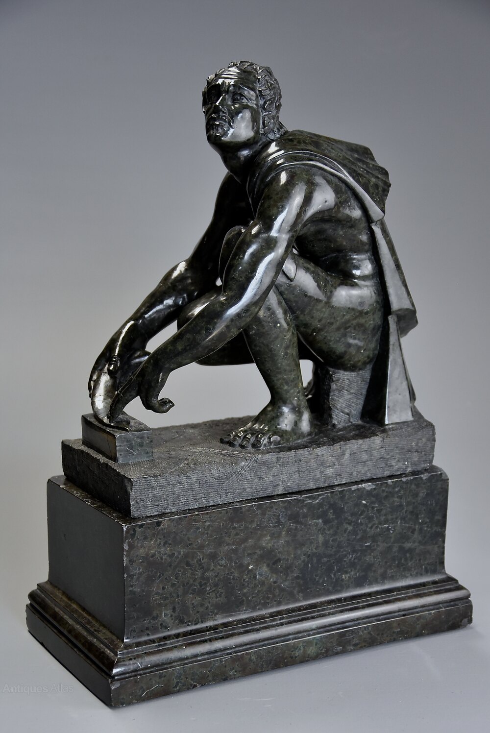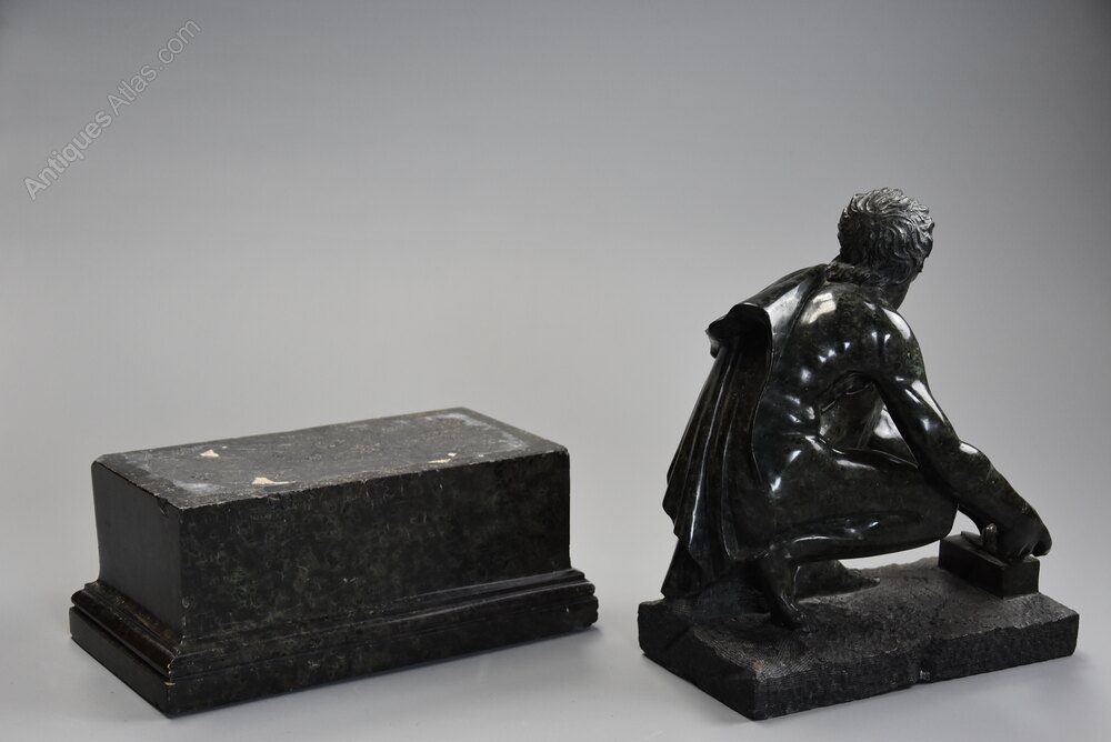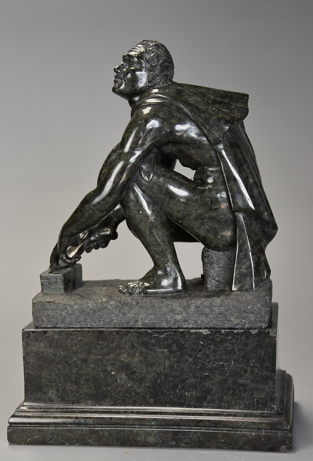 A finely carved Italian 19th century (circa 1870) Grand Tour verde Prato or serpentine figure of ‘Arrotino’ known as The Knife or Blade Sharpener, probably from The Grand Tour.This figure consists of ‘Arrotino’ in seated position sharpening his knife or blade on a whetstone with a cloak over his shoulder.