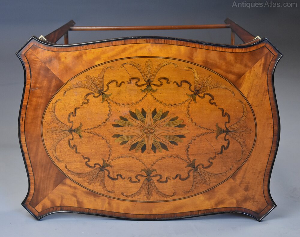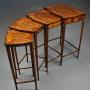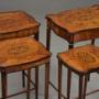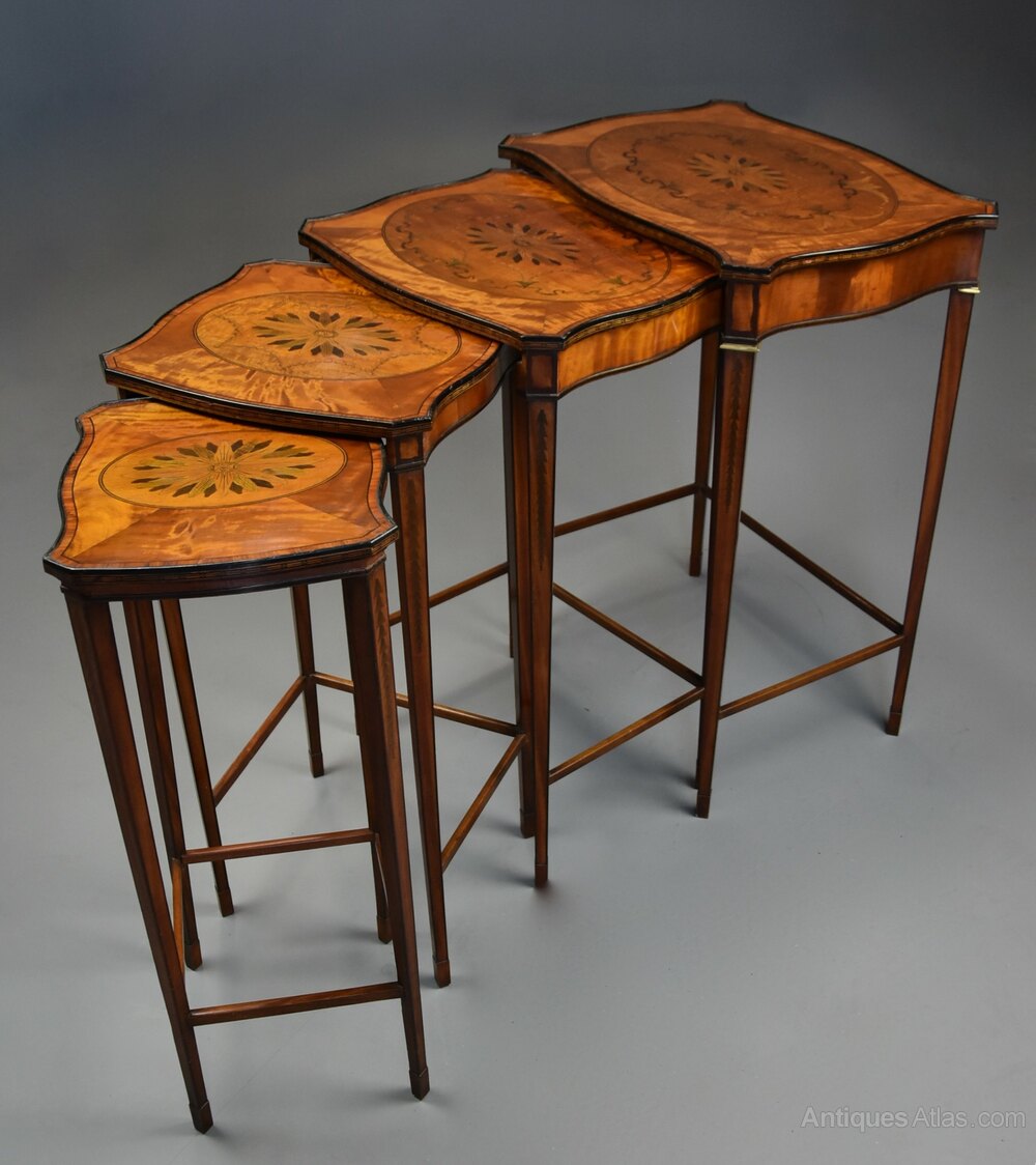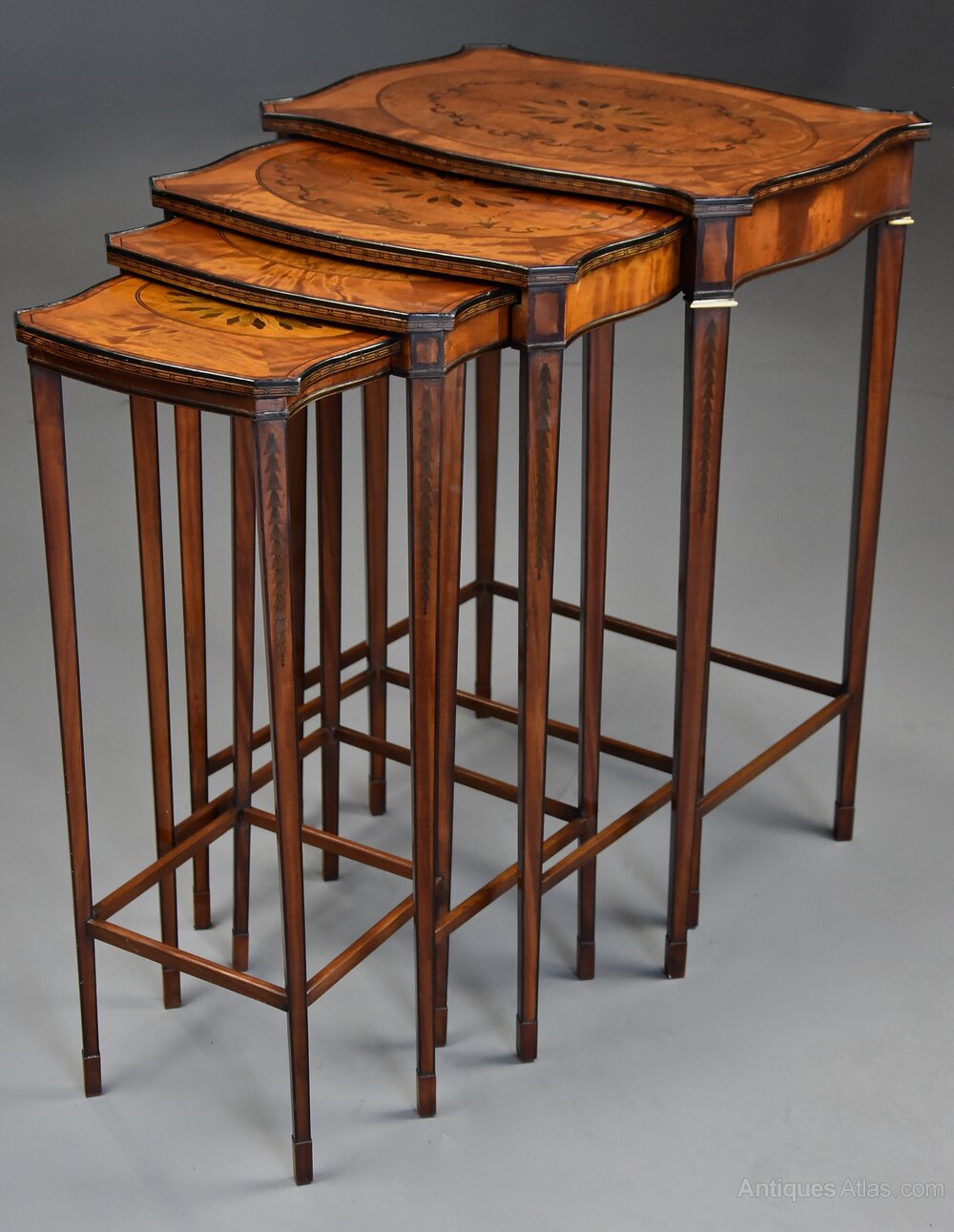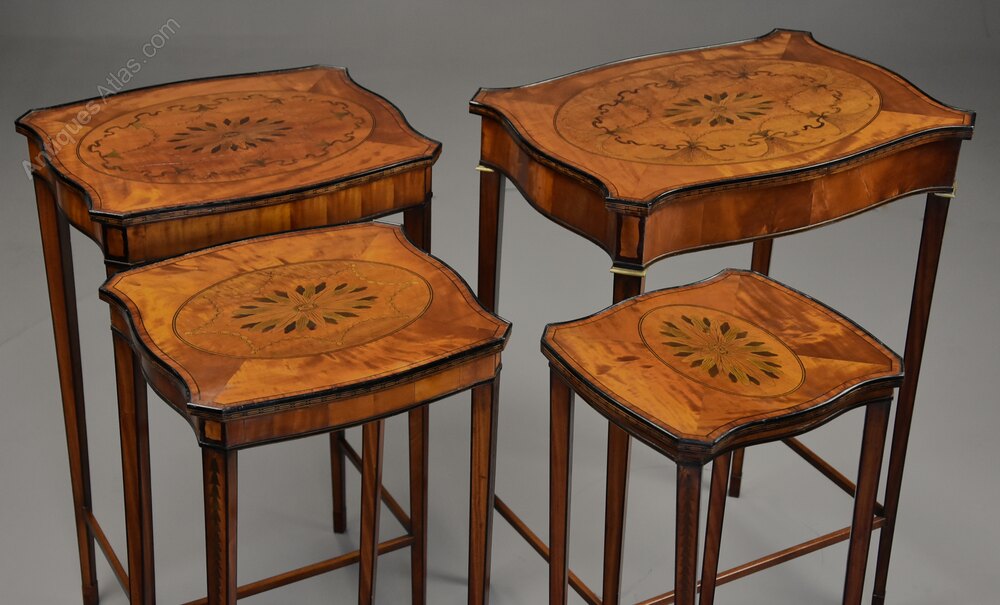 An elegant fine quality Edwardian (circa 1910) Quartetto nest of inlaid satinwood tables of serpentine form and in the Sheraton style.This elegant nest of tables each of serpentine form, all with central inlaid foliate design within oval satinwood panel with ebony and boxwood banding, all with outer quarter veneered satinwood panels, the three larger tables with inlaid stained boxwood foliate, swag and ribbon decoration, all with outer tulipwood banding and outer ebonised moulding.