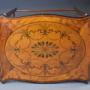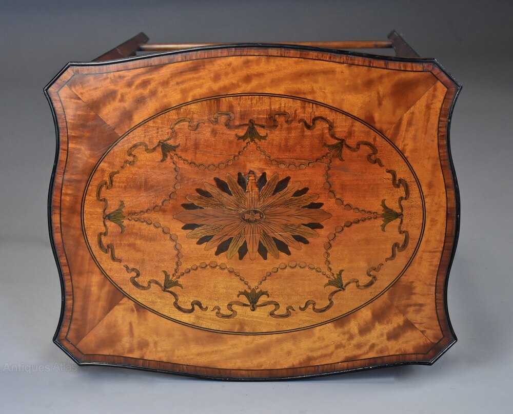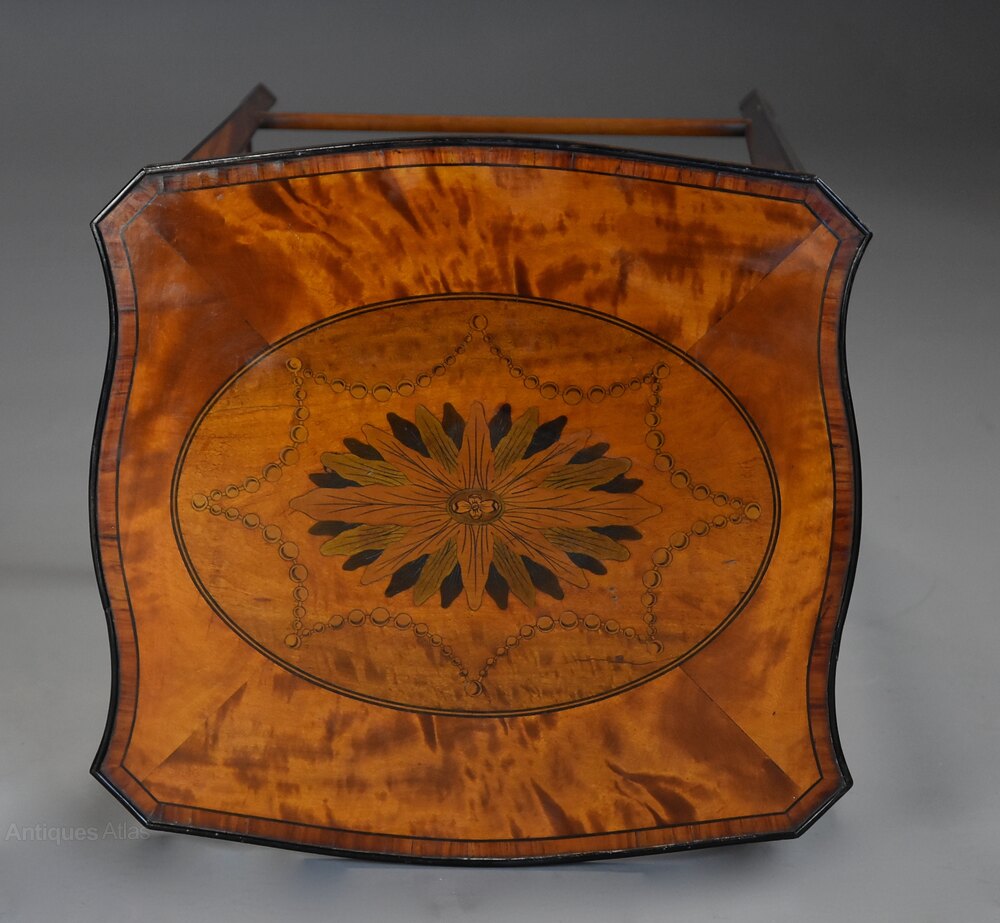 This leads down to an intricate ebony and boxwood inlaid design to the edge with serpentine shaped satinwood frieze below with raised ebony and boxwood banding.
