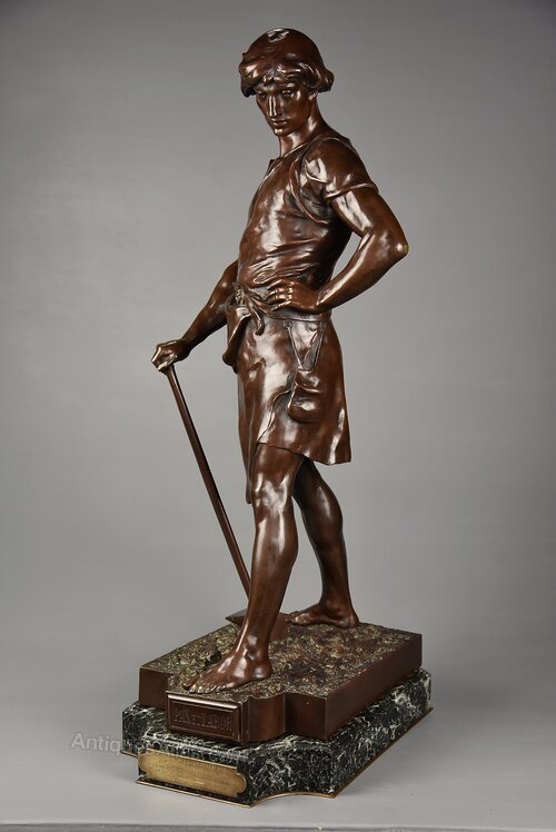 A large superb quality late 19th century (circa 1880) French bronze 'Pax et Labor' (translating to 'Peace & Labour') of fine patina by Emile Louis Picault (1833-1915).This bronze consists of a muscular blacksmith or riveter who is used to physical work wearing leather aprons, his sledge hammer resting on the ground supported on a shaped green verde antico marble base.