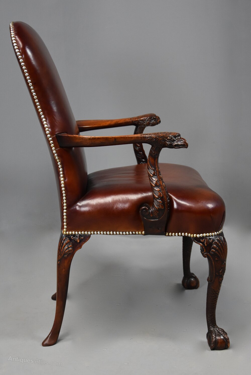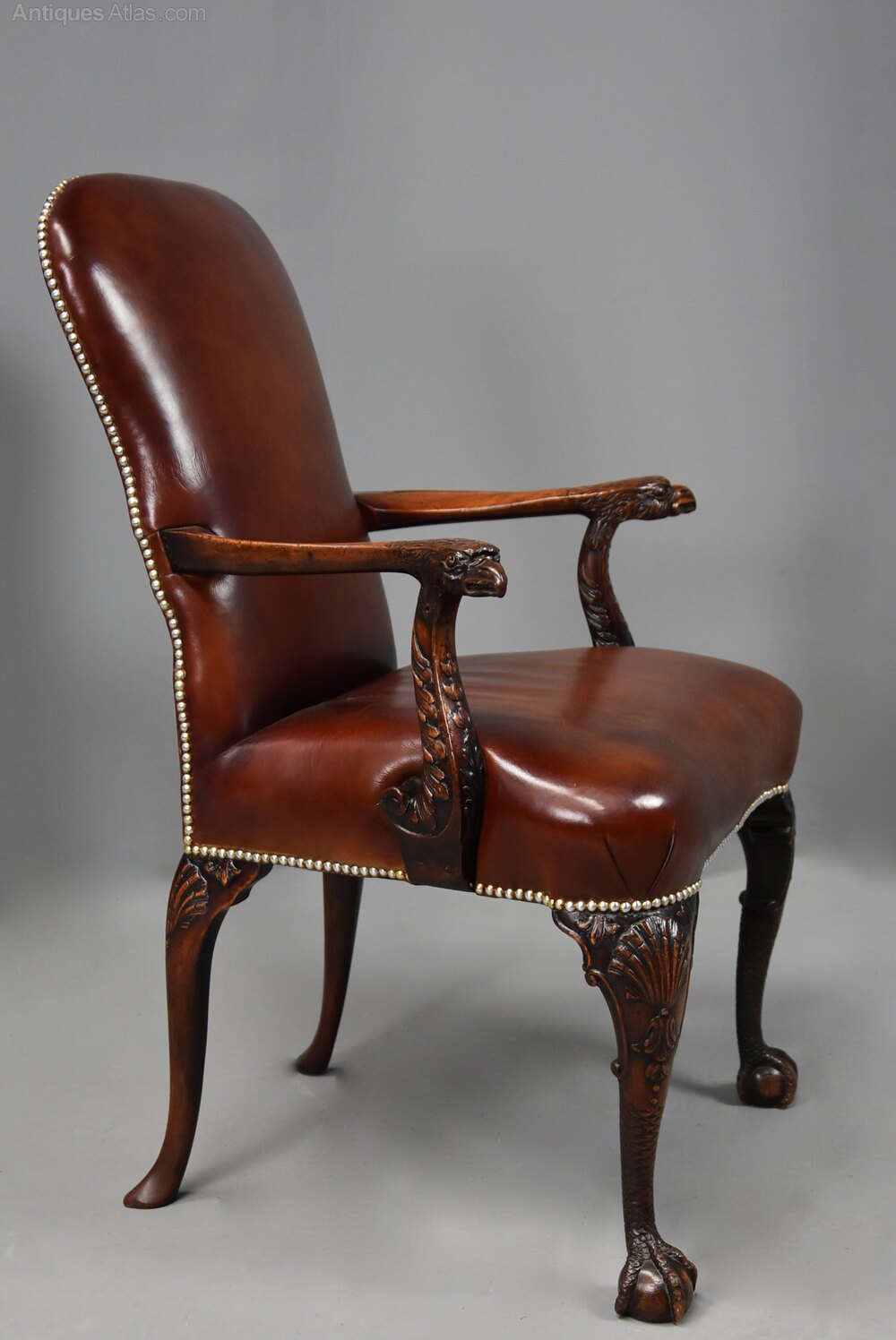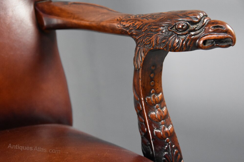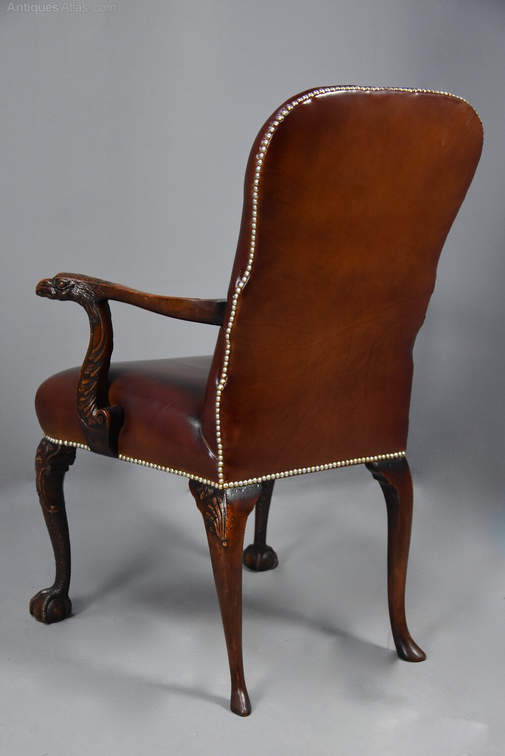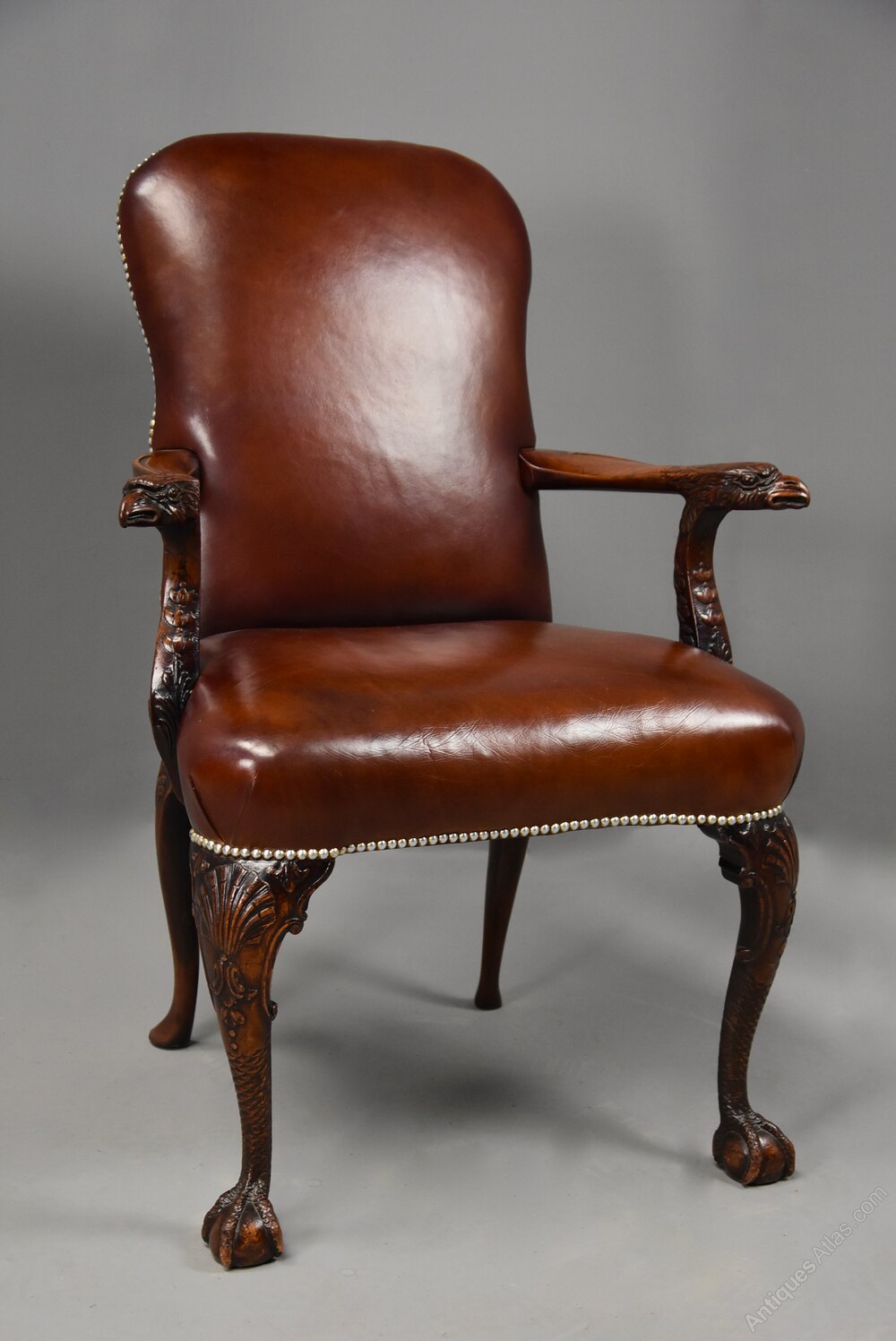 A superb quality late 19th century walnut open armchair in the early 18th century style with wonderful carving and patina comparable to that of a period early 18th century piece of furniture.This armchair consists of an upholstered tan leather padded back and seat with stud decoration with superbly carved arms in the form of eagle heads, the shaped arm supports with carved acanthus and floral decoration with scroll design to the side.