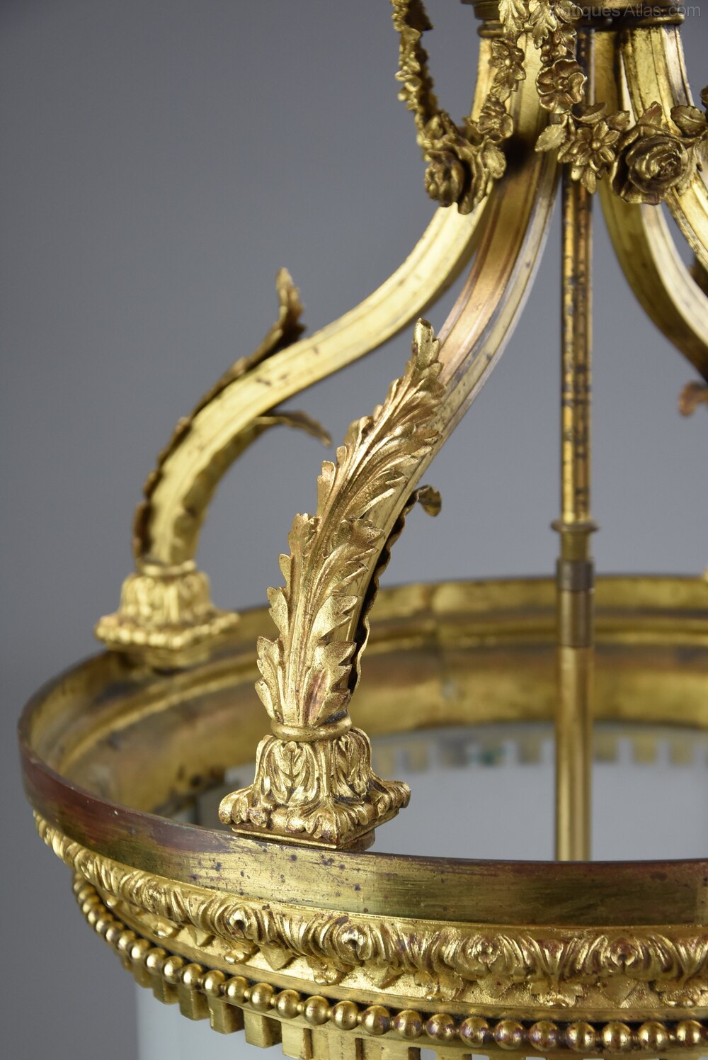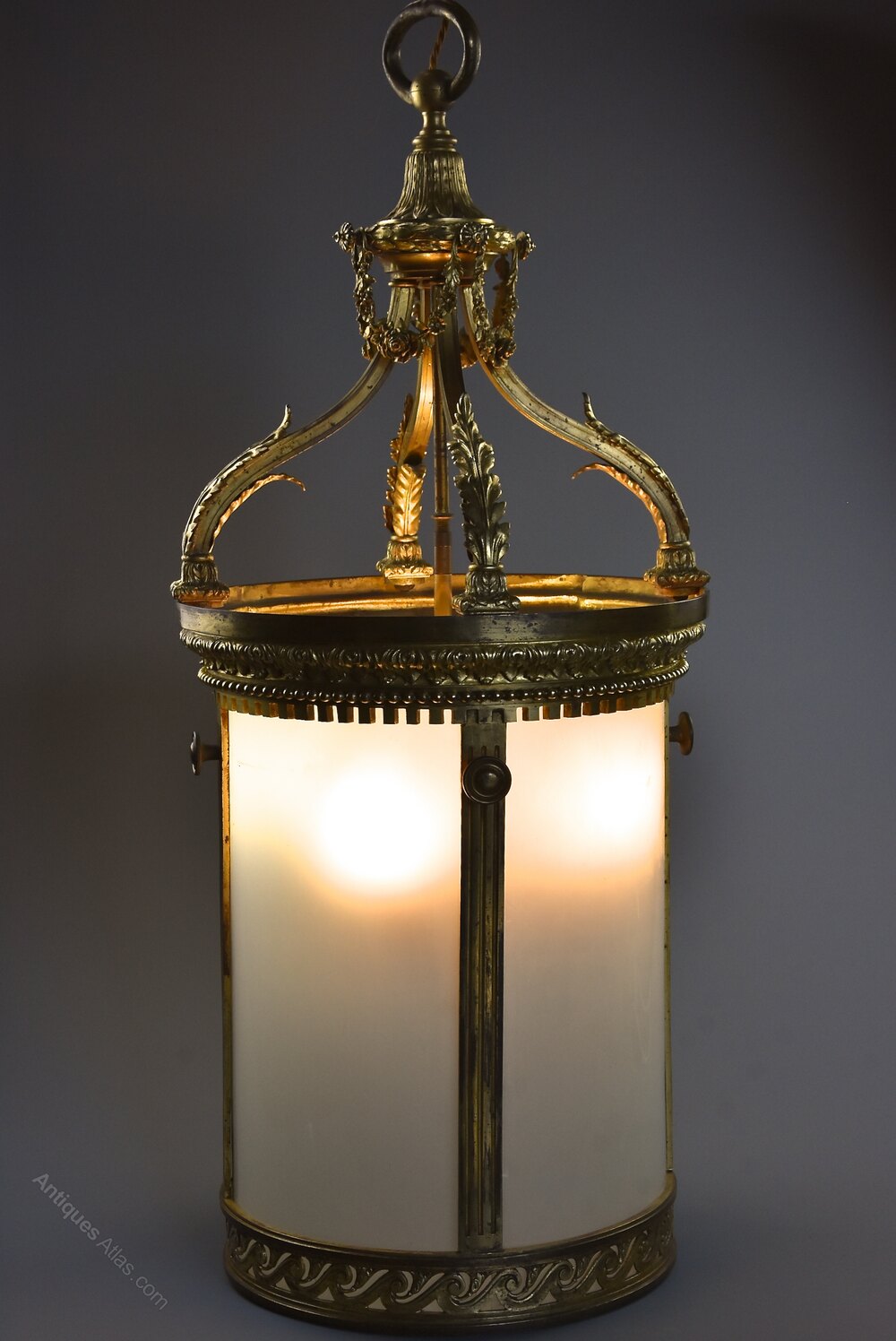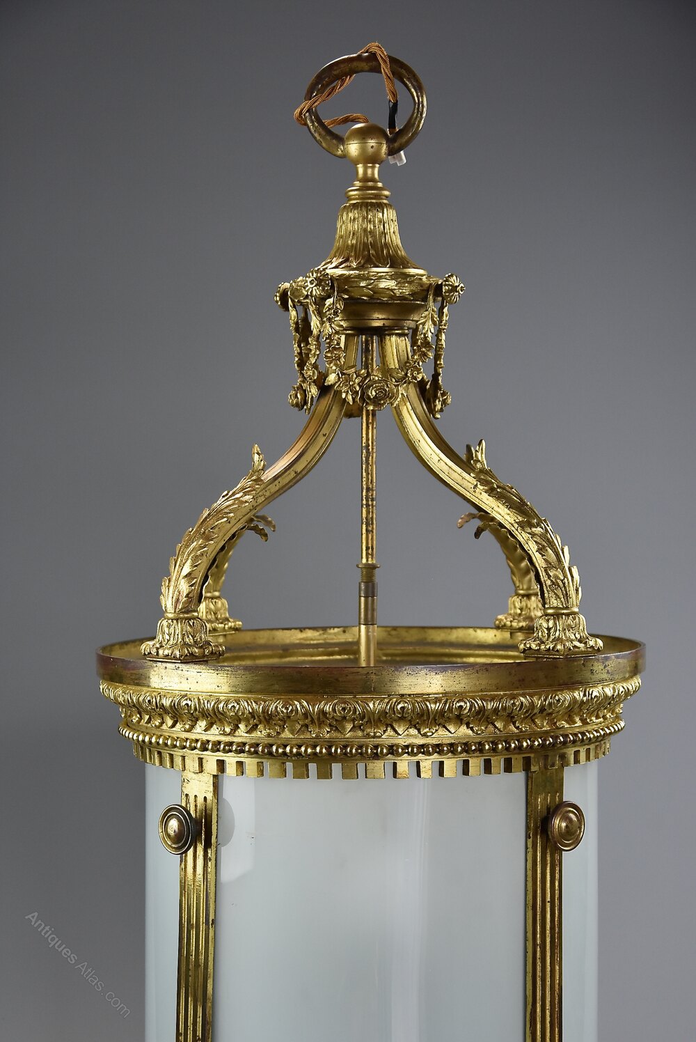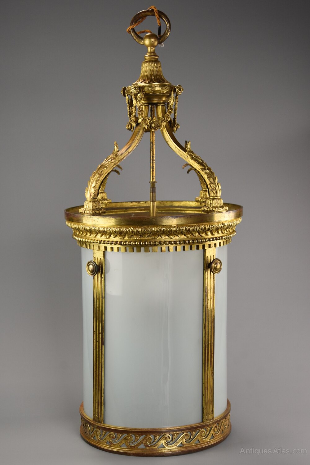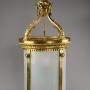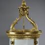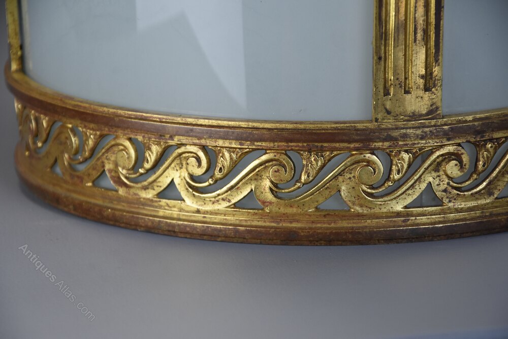 The lantern having four opaque glass panels held in place with four reeded uprights, the decorative and fine quality gilt bronze frame with foliate edge to the top, ball decoration and dentil design leading down to a pierced Vitruvian scroll and foliate design below.