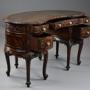 The desk is supported on French style cabriole legs with foliate carved decoration to the knee and leg, terminating with a scroll foot.