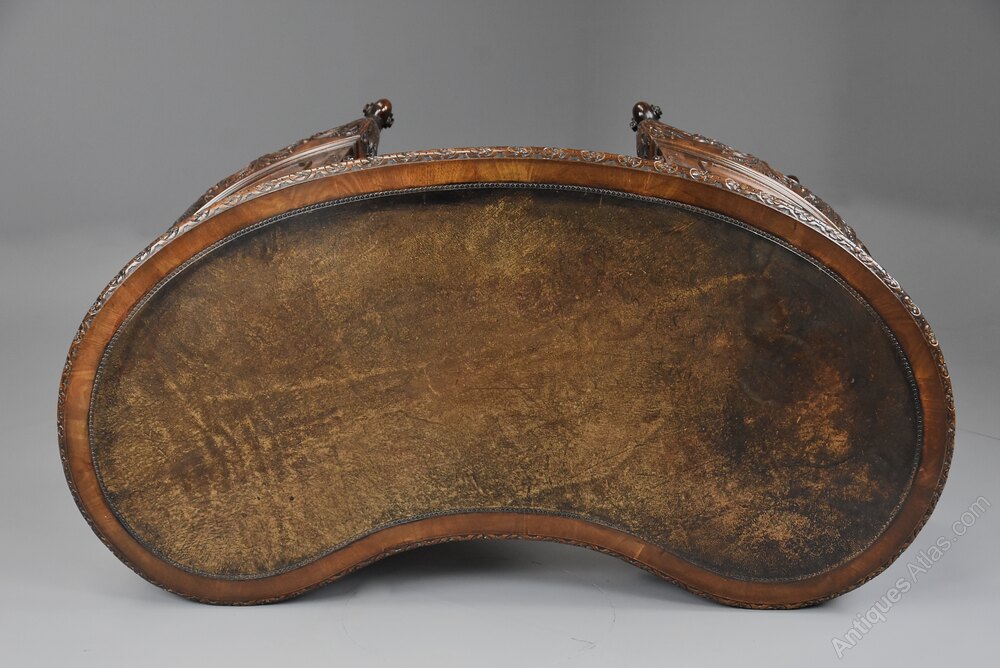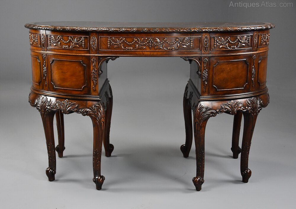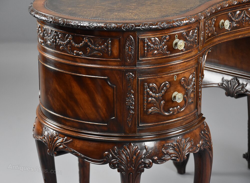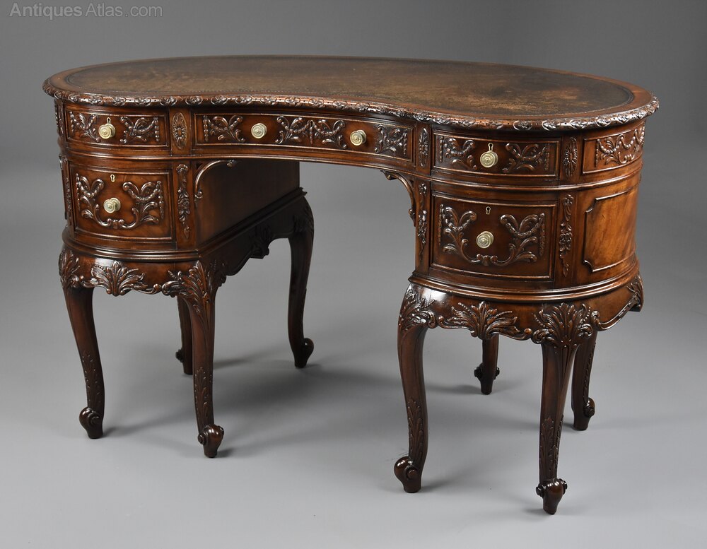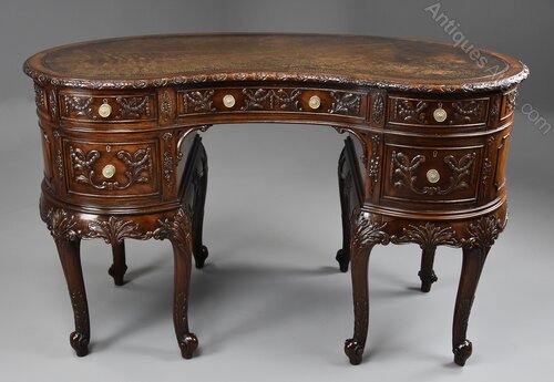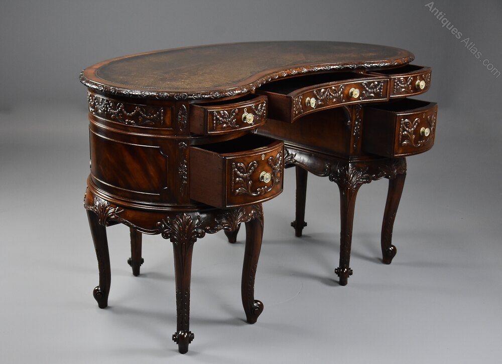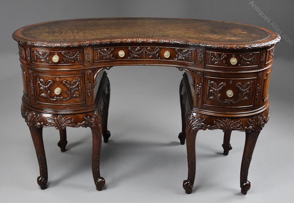 A superb quality Edwardian (circa 1905) finely carved mahogany kidney shaped freestanding desk or this could be used as a dressing table.This desk consists of an original kidney shaped brown leather top with tooled edge, mahogany crossbanding and a carved and moulded edge.