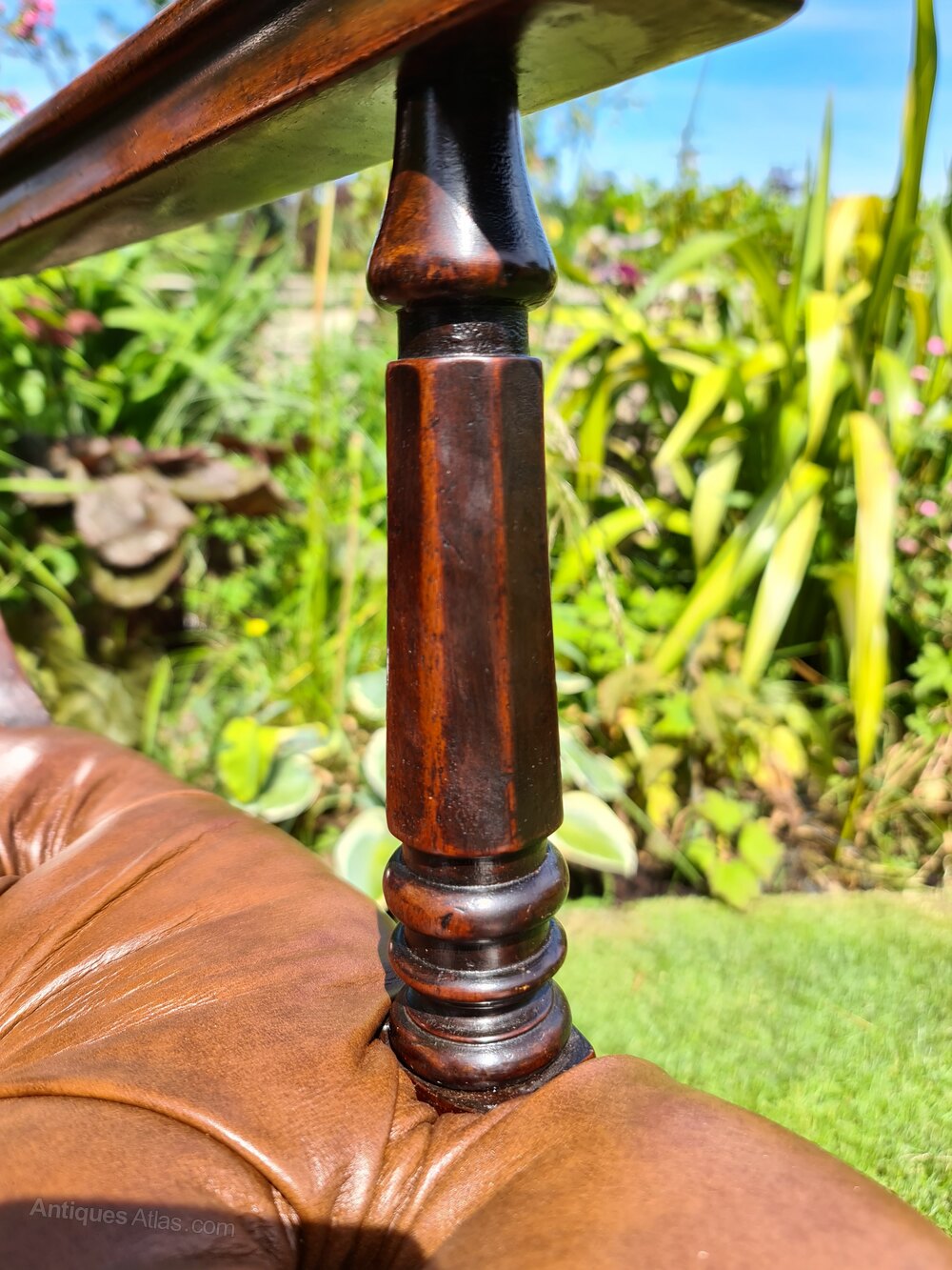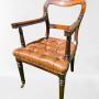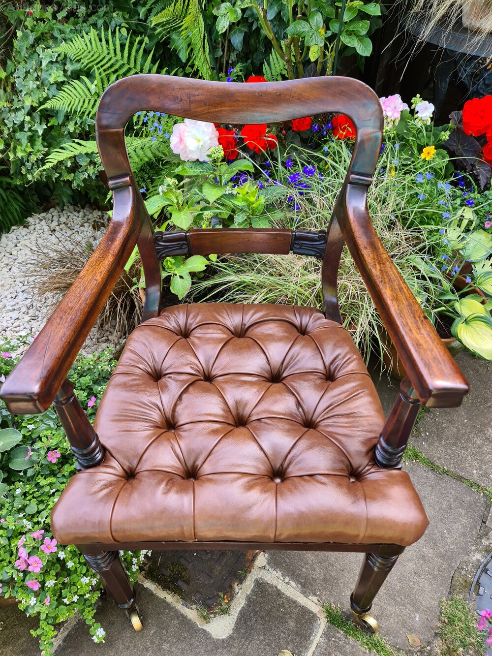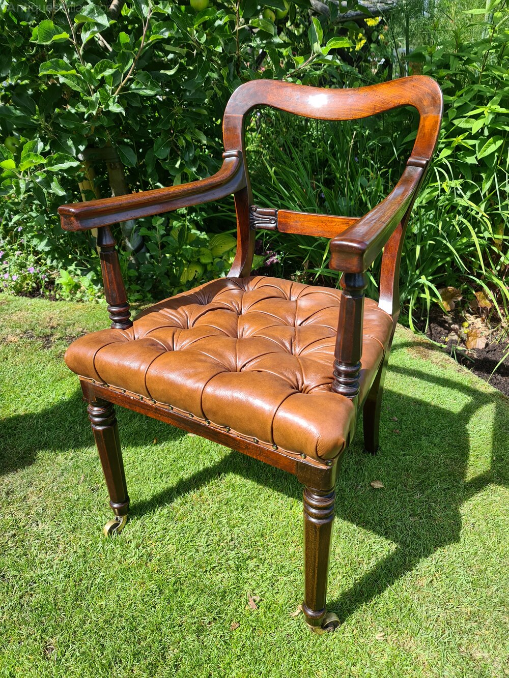 An early 19th Century mahogany desk chair with great colour, and in excellent condition. Completely sound and with new upholstered real hide deep buttoned seat and original good quality brass castors. A quality chair.Max Dimensions: