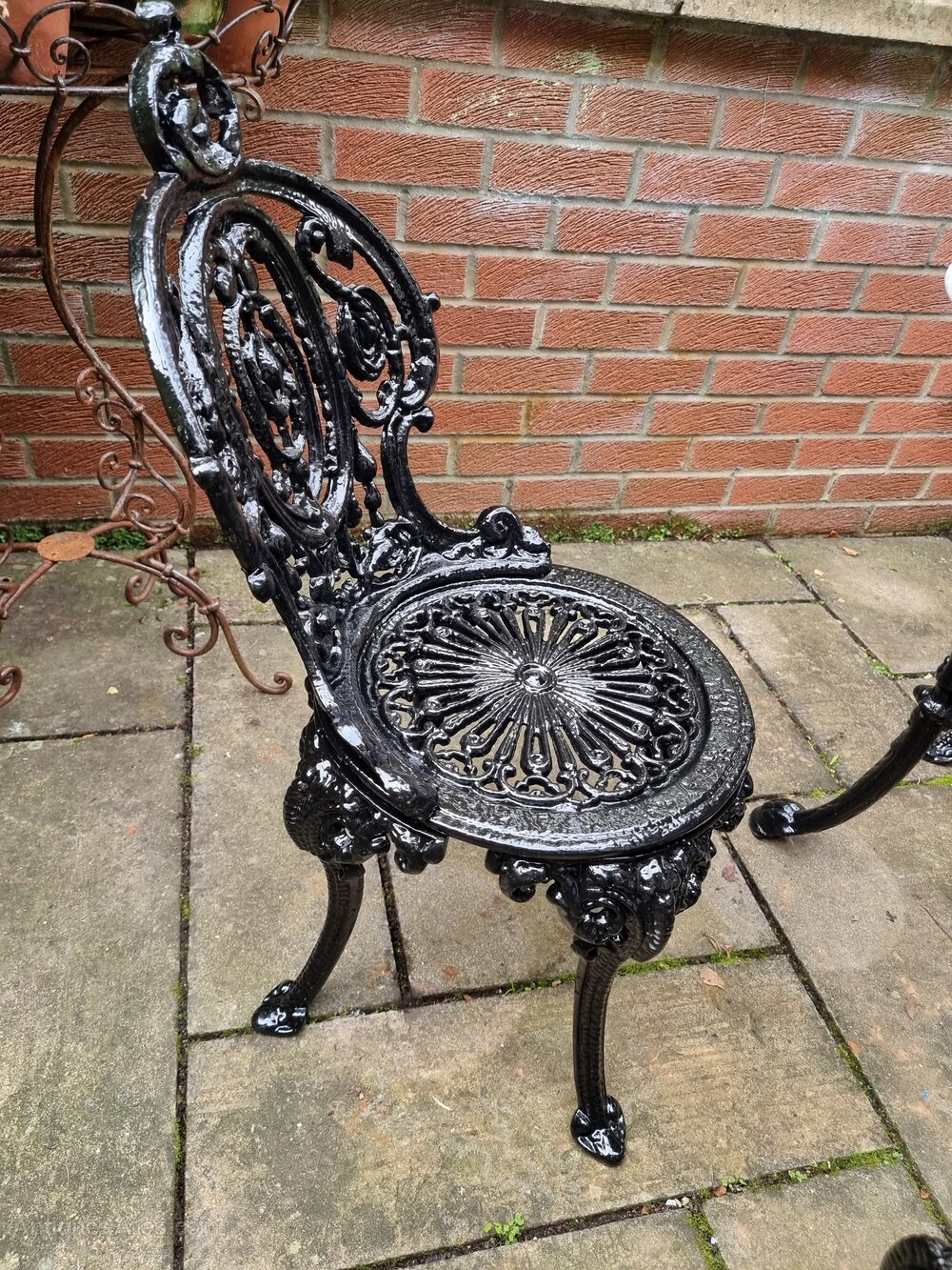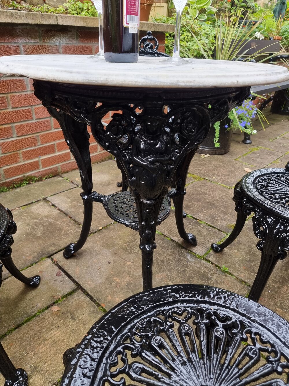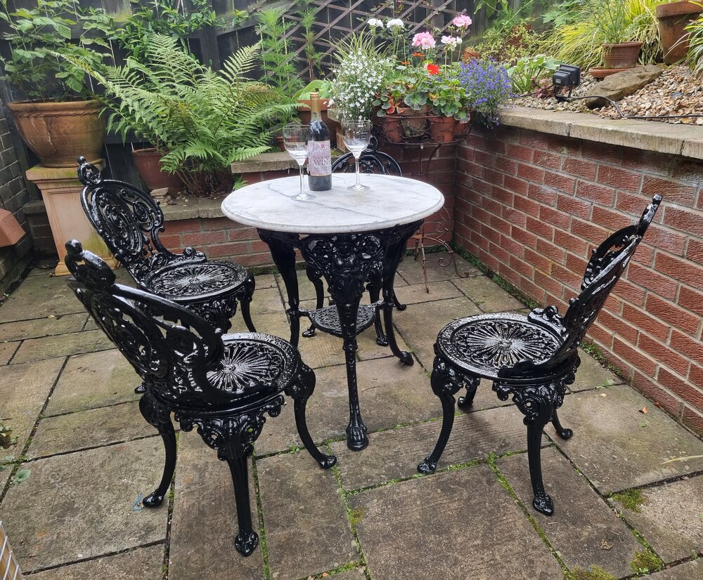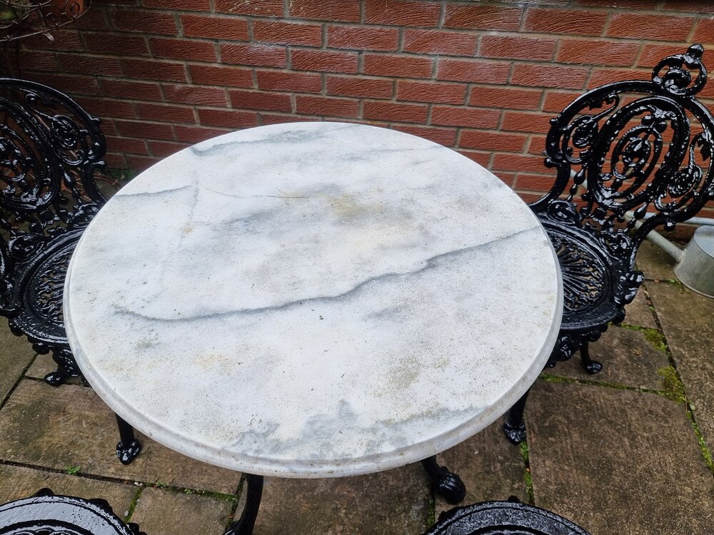 An extremely heavy early early cast-iron garden set circa 1930, with new hardy black paint. Traditional heavy cast-iron table with wonderful period figured white marble top. Would make a wonderful look as an addition to your patio or garden.Table Dimensions: