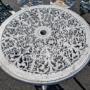 Delivery always available.A set of five heavy cast-iron chairs with bistro table with cast-iron base and metal top, circa 1920. All sturdy and in good condition, just need a coat of paint if required.