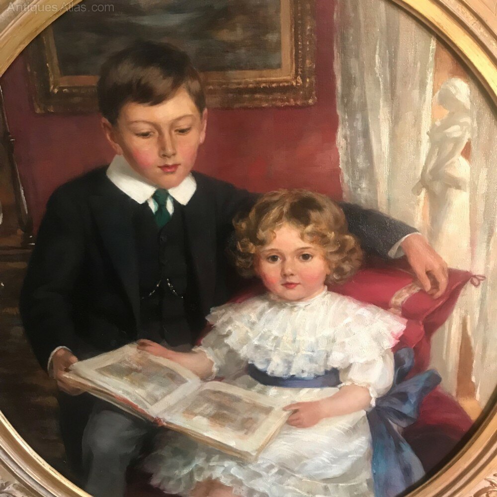 This fine example of Edwardian portraiture was almost certainly a commission and probably painted during Dixon’s time in Edinburgh. Here we see the young Constance sitting on a chair and holding open a book while her older brother looks over towards the coloured plates displayed within it.
