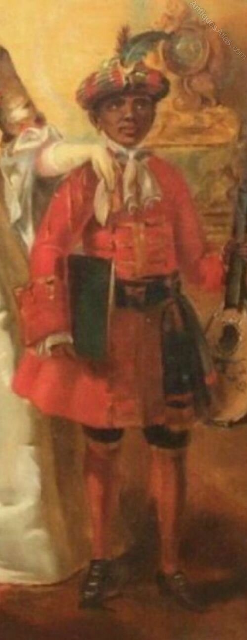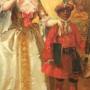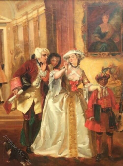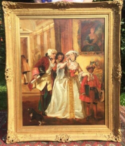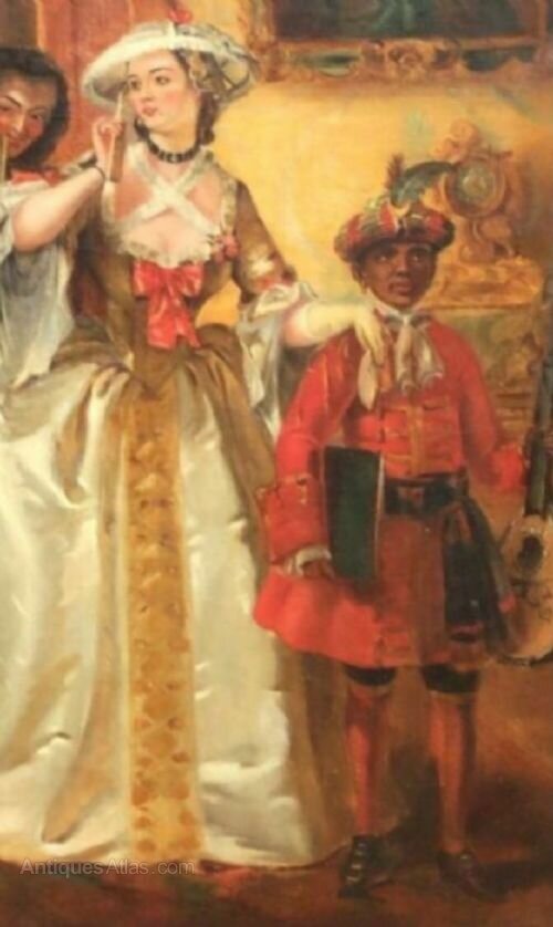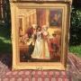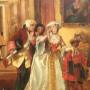 Large romantic genre scene oil painting on canvas dating late 19th century depicting an affluent lady wearing a beautiful satin ball gown being greeted by a gentleman of distinction, accompanied by a servant musician to her left who is holding a mandolin, with their pet dog painted in the lower left bottom corner.The scene is a colourful example of generously applied paints of rich colour.