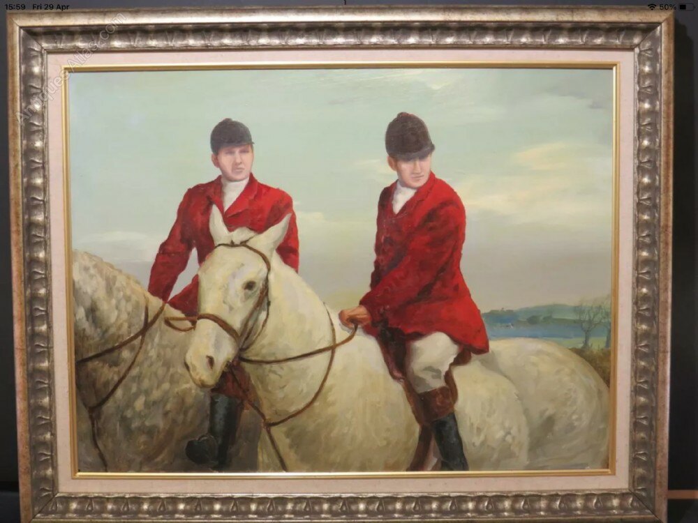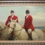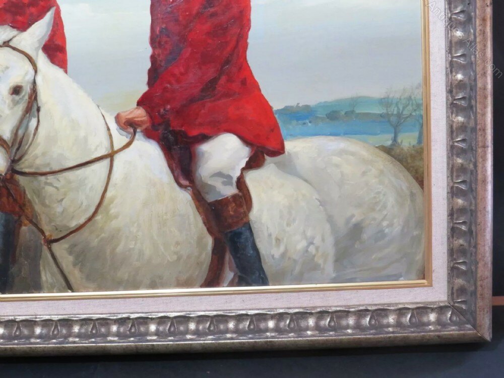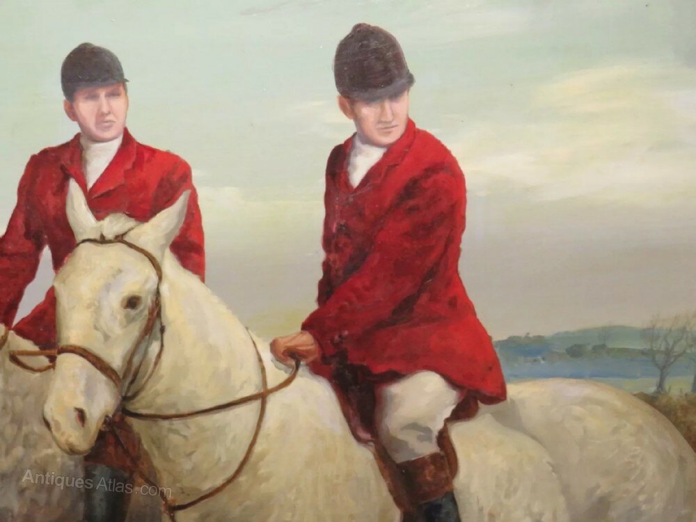 JANUARY SALE PRICE : Was £1200 / Now £950A lovely large sporting oil painting on panel of two huntsmen wearing their red jackets on horseback about to hunt.