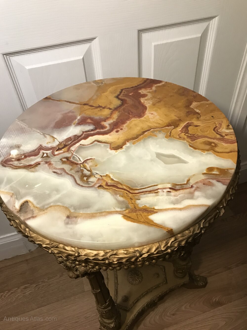 19th French Pedestal Wine Table with round 1” inch thick veined Onyx polished top made with cultured marble and standing on three turned wooden columns decorated with flower mouldings and finished in gilt.ABOUT ONYX