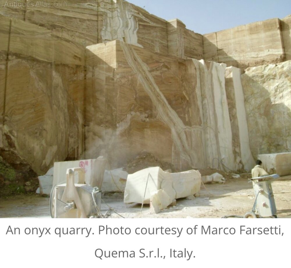 In the commercial stone industry, onyx refers a category of stones that are made of layered bands of light-colored or translucent minerals. Most slabs of onyx are what a geologist would call banded calcite. This same material also goes by the names onyx marble, Mexican onyx, or Egyptian alabaster.
