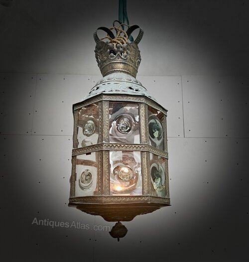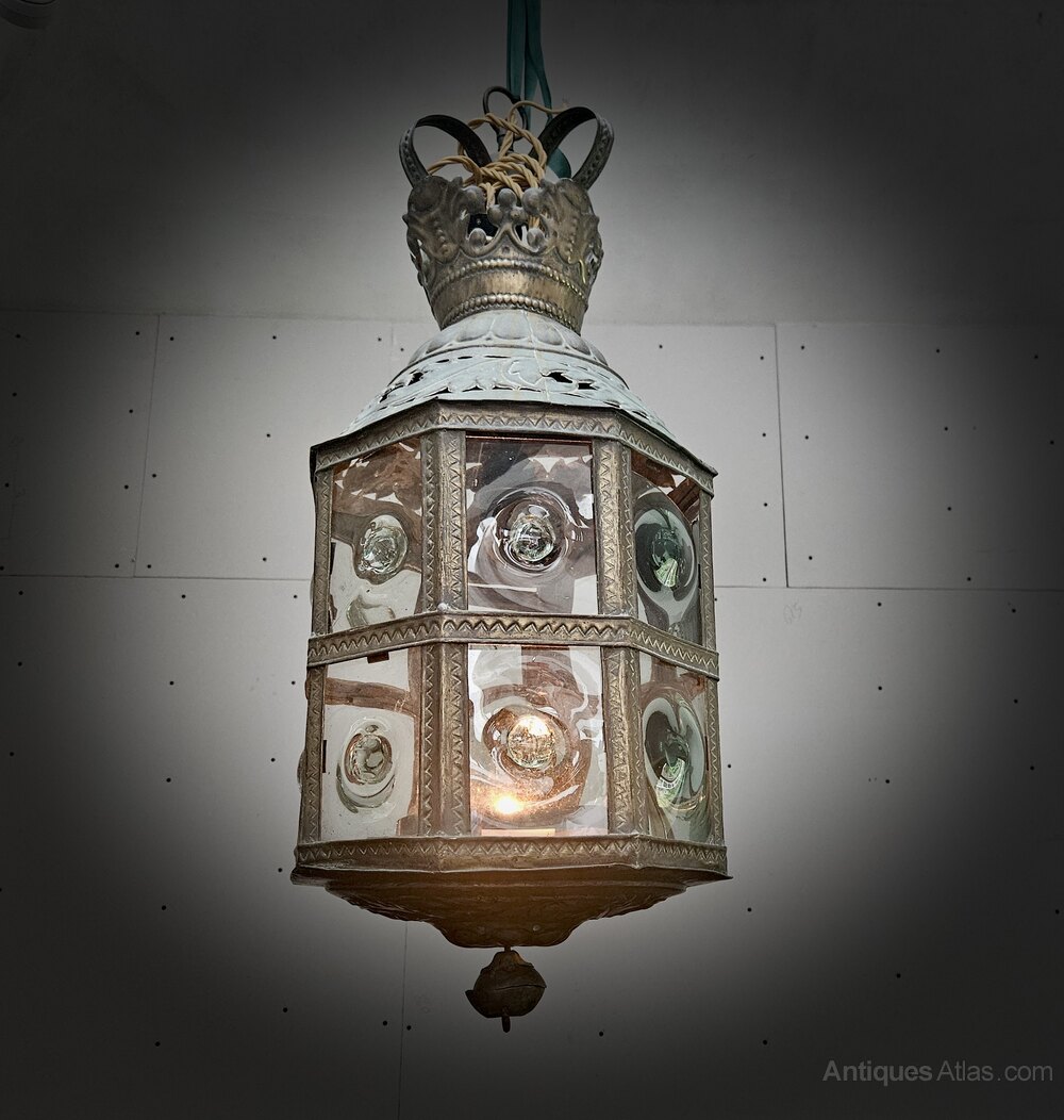 Large Lantern With Hand Blown Bulls Eye Glass. Very large hanging lantern, dating from the late 19th century. Originally for candlelight, but now rewired for electric (it can still be used with candlelight as can be seen in the photo if required).One sheet of glass has a piece broken off.