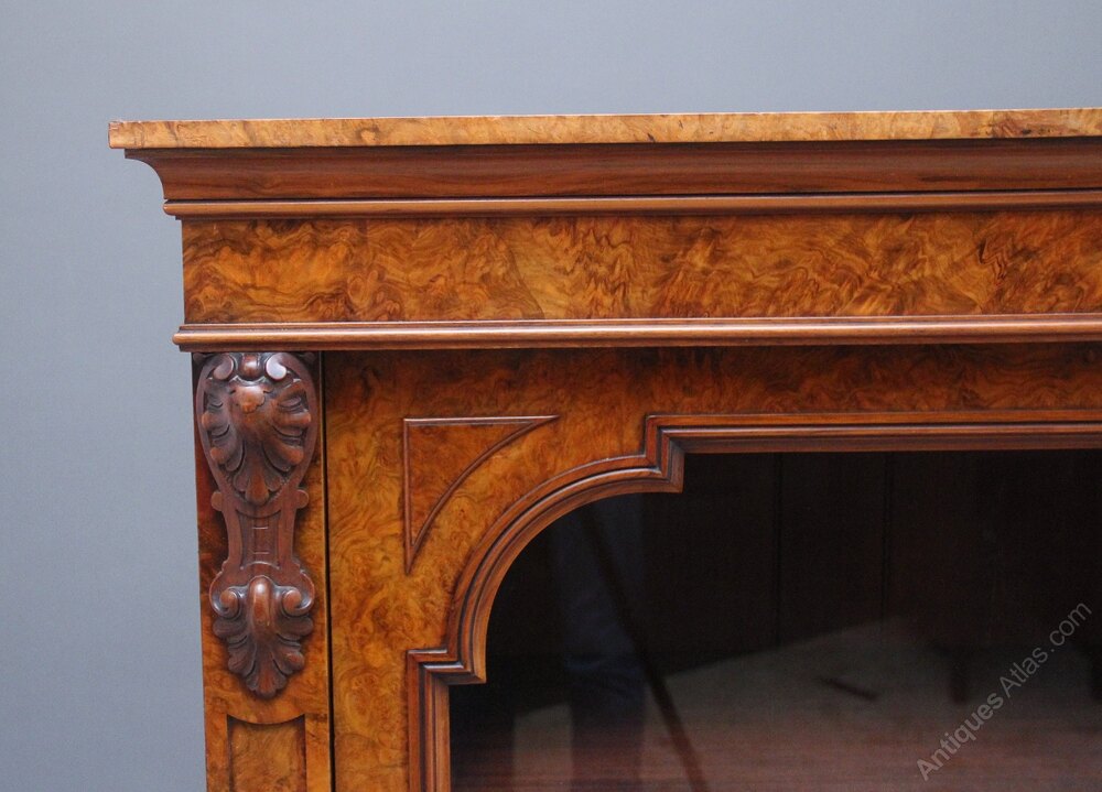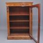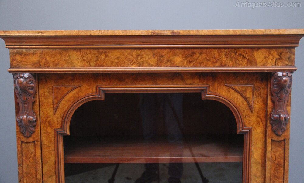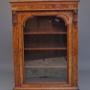A large and impressive 19th Century burr walnut bookcase/cabinet, having a wonderful figured stepped top above a single shaped panelled glazed door with a double moulded edge with raised triangular decoration in the top corners, opening to reveal three adjustable shelves, columns either side with bold carved decoration at the top on either side, raised on a moulded plinth base. Wonderful burr walnut figuration throughout including the sides of the cabinet, a truly remarkable piece of furniture. Circa 1850.38 3/4" x 17" x 54 1/4" high