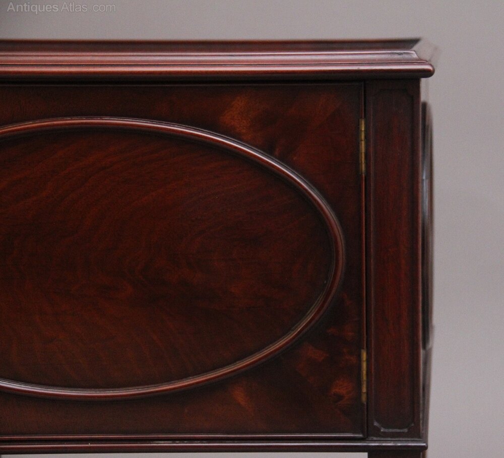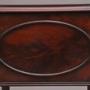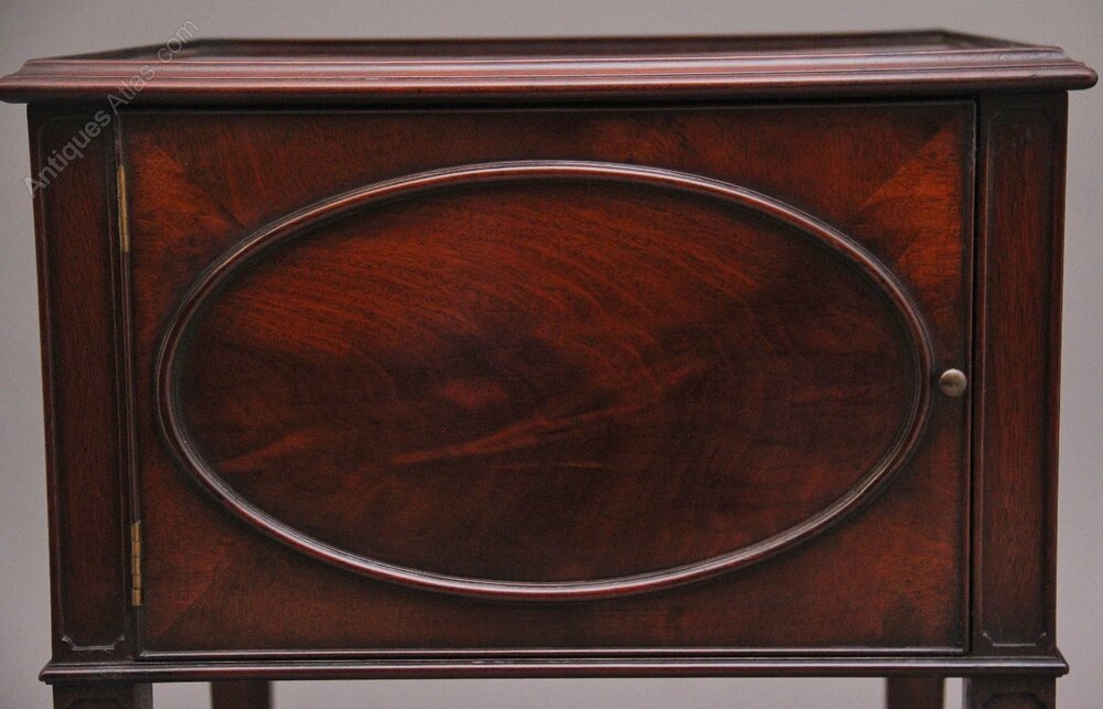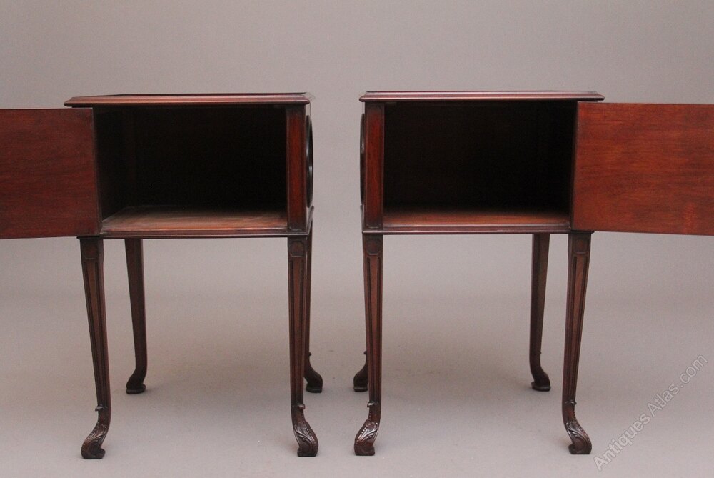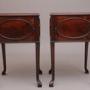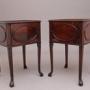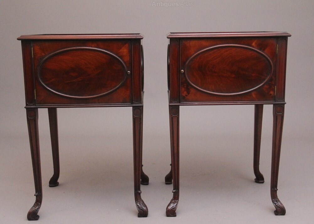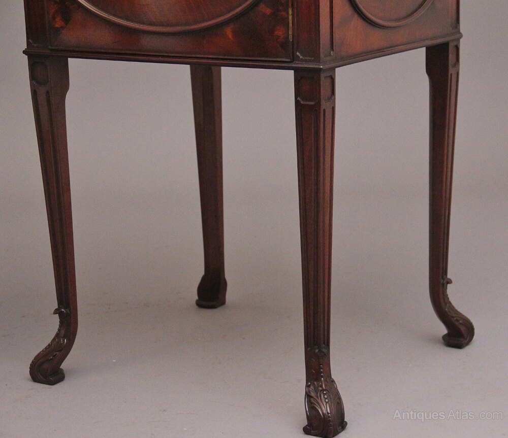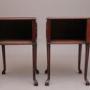 Pair mid 20th Century flame mahogany bedside cabinets in the Chippendale style, wonderful figured tops with a stepped moulded edge, a single hinged door opening to reveal a large compartment space, the door fronts and either sides having decorative flame mahogany oval panels, supported on elegant square tapering leg terminating on a carved hoof foot. Circa 1960.19" x 16 1/4" x 29 3/4" high