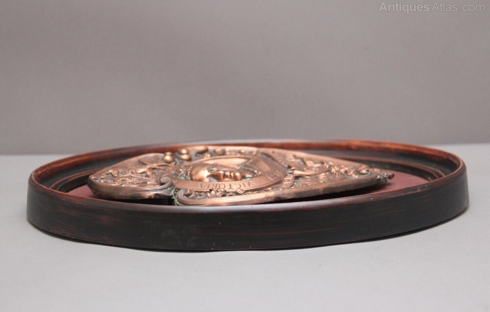 Early 20th Century Queen Victoria Commemorative Jubilee Plaque in a later oval frame, the copper plaque features a profile bust of Queen Victoria in her later years, often referred to as her "Jubilee Head", the plaque is inscribed "Imperatrix Regina" Latin for "Empress and Queen," reflecting her titles, the dates showing 1837 - 1887 marking her fifty-year reign, while the upper corners are marked 1837 (accession) and 1901 (death), suggesting this specific version may have been issued or updated as a memorial piece shortly after her passing. The bottom border prominently lists major British Empire territories of the time: New Zealand, Canada, Australia, and Cape of Good Hope.9 3/4" x 12 3/4" x 1" thick