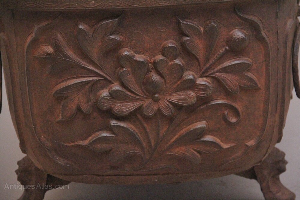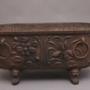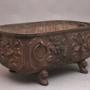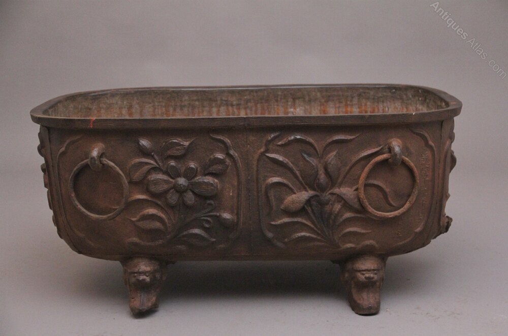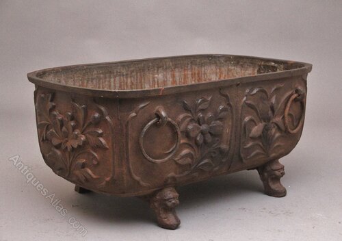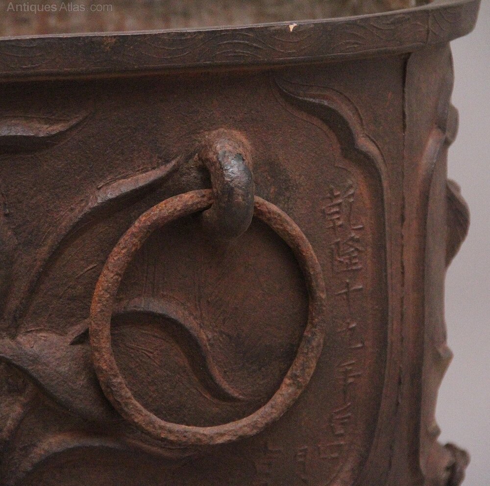 An early 19th Century Chinese cast iron temple bath from the Qing dynasty (1644–1912) Featuring repoussé lotus motifs and floral designs along the sides, having the original four cast iron ring handles and standing on decorative mythical creature feet. These vessels were typically used as water baths or ritual troughs in Buddhist or Taoist temples. The lotus petal border (visible around the base of the handle) is a classic symbol of purity in these traditions.On one side of the bath there is an inscription of the Chinese reign mark which indicates the specific year it was purportedly made which states "19th year of the Qianlong Emperor’s reign" which corresponds to the year 1754 (The Qianlong Period (1736–1795): This era is considered a "golden age" for Chinese craftsmanship)