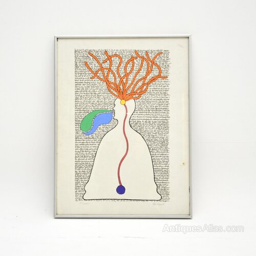 A superb and very rare limited edition vintage framed and signed lithograph print by Peter Schmidt – Flowing in the Right Direction.This is numbered number 11 / 35, it dates from 1971. It has a little wear and a small mark on the outer edge of the artwork. There is a tiny chip to the upper right corner of the glass front, seen in the images.