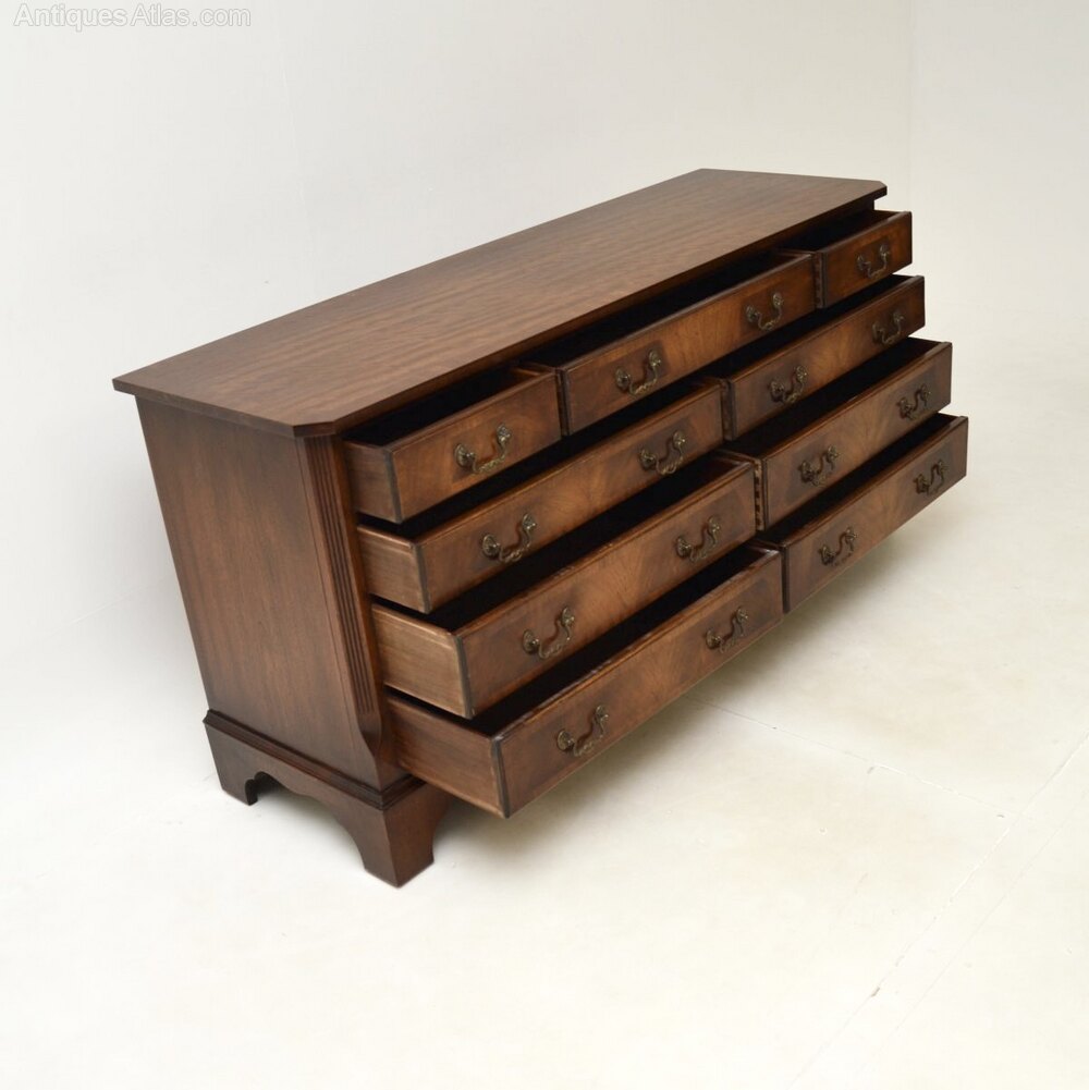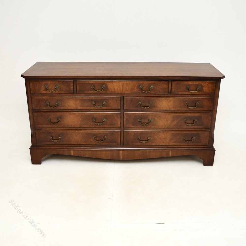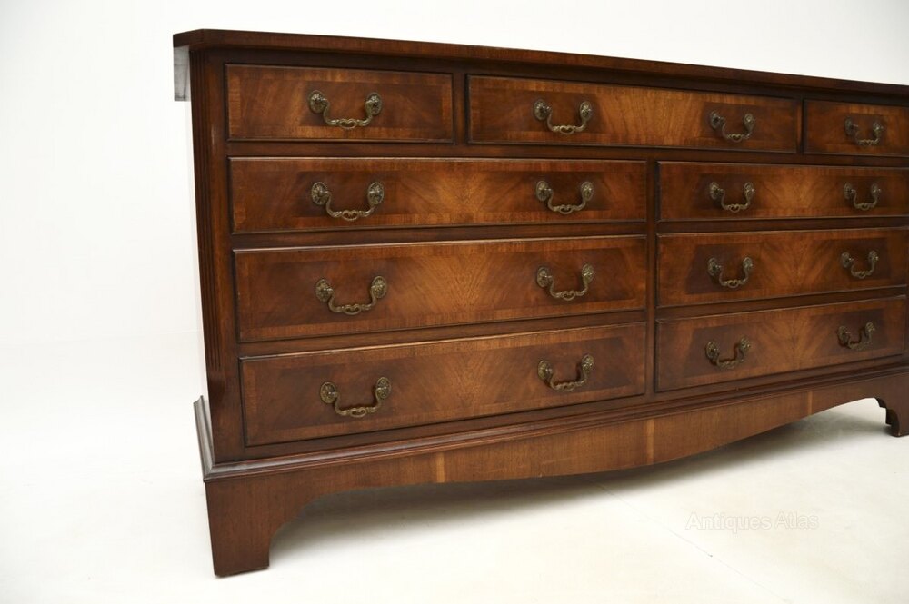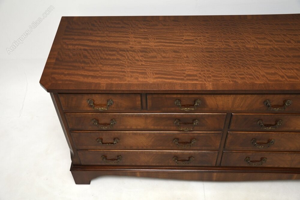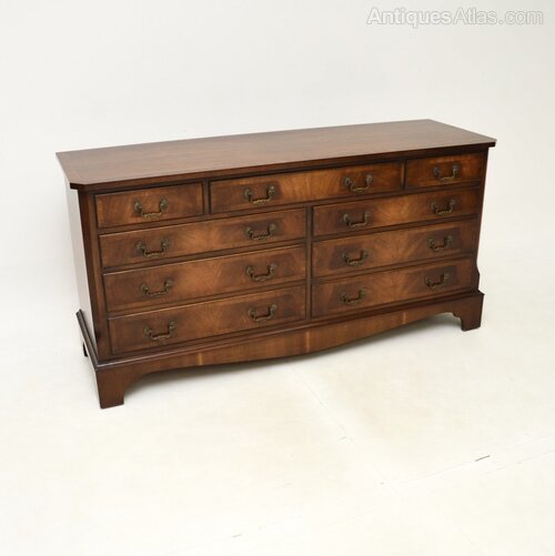 A smart and extremely well made antique Georgian style mahogany chest of drawers / sideboard, which would also be ideal for a TV stand. This was made in England and dates from around the 1930-50’s.It is of amazing quality and is a very useful size, with lots of storage space inside the generous drawers. The top and drawer fronts are cross banded, this has lovely brass handles. It sits on a base with bracket feet, it has lovely reeded and canted corners.