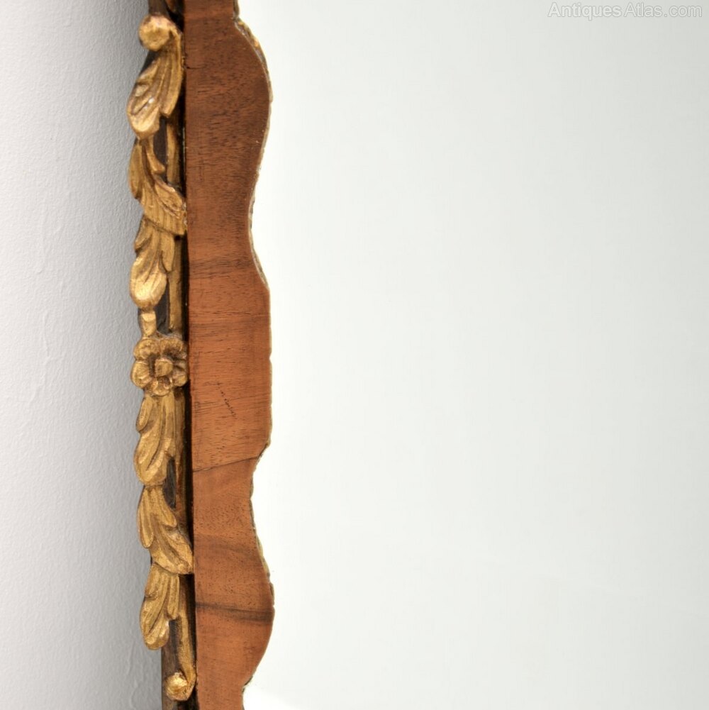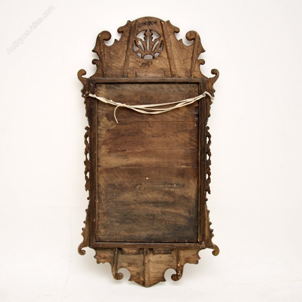 An absolutely stunning antique George II period walnut mirror. This was made in England, it has a carved date and location on the back reading: London, 1741.It is of superb quality and is beautifully designed, with a sleek and refined look. The walnut has a gorgeous patina, there are beautifully shaped edges, a pierced upper central section and lovely carving on the edges. The central pierced section and carved edges have a gilded finish.