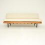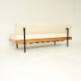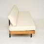 A stylish and extremely well made vintage sofa bed in steel and birch. This was made in England, it dates from around the 1950’s.The quality is outstanding, this has beautiful lines and looks amazing from all angles. The solid birch frame has a gorgeous colour tone and lovely grain patterns, with exposed biscuit joints at the corners. The light wood tones contrast nicely with the ebonised steel frame. The back rest can swivel up, to increase the depth of the seating area when it needs to be used as a bed.