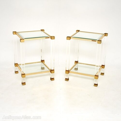 A stylish and very well made pair of vintage French Lucite and glass side tables by Pierre Vandel. They were made in France, they date from the 1970’s.The quality is superb, they are a lovely size with a very useful design. Each table has two tiers with removable glass tops, the top glass tiers have finely bevelled edges. The Lucite legs are held together by brass plated aluminium, each table has the Pierre Vandel makers label.