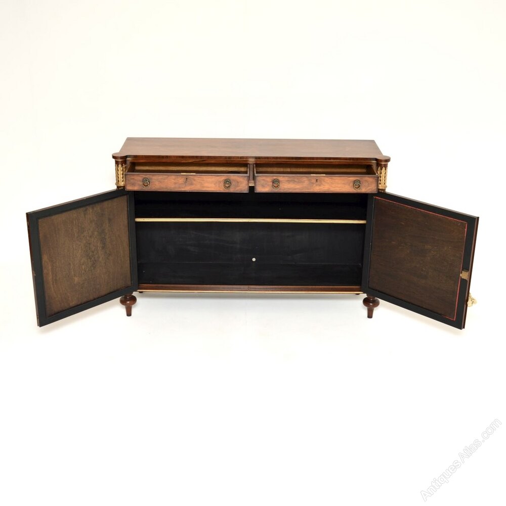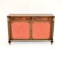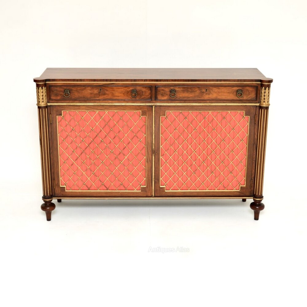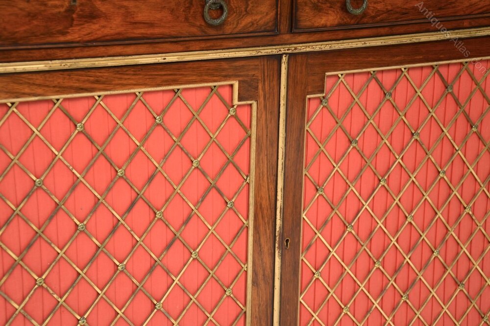 A stunning antique Regency Style rosewood grill front sideboard. This was made in England, it dates from around the 1930-50’s.The quality is outstanding, this is beautifully designed and is a very useful size. The rosewood grain patterns are gorgeous, this has wonderful parcel gilt embellishments on the carved edges. The grill front doors have intricate brass details and have pleated red fabric in the door panels. There is plenty of storage space in the two door compartment, with additional storage in the upper drawer.