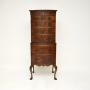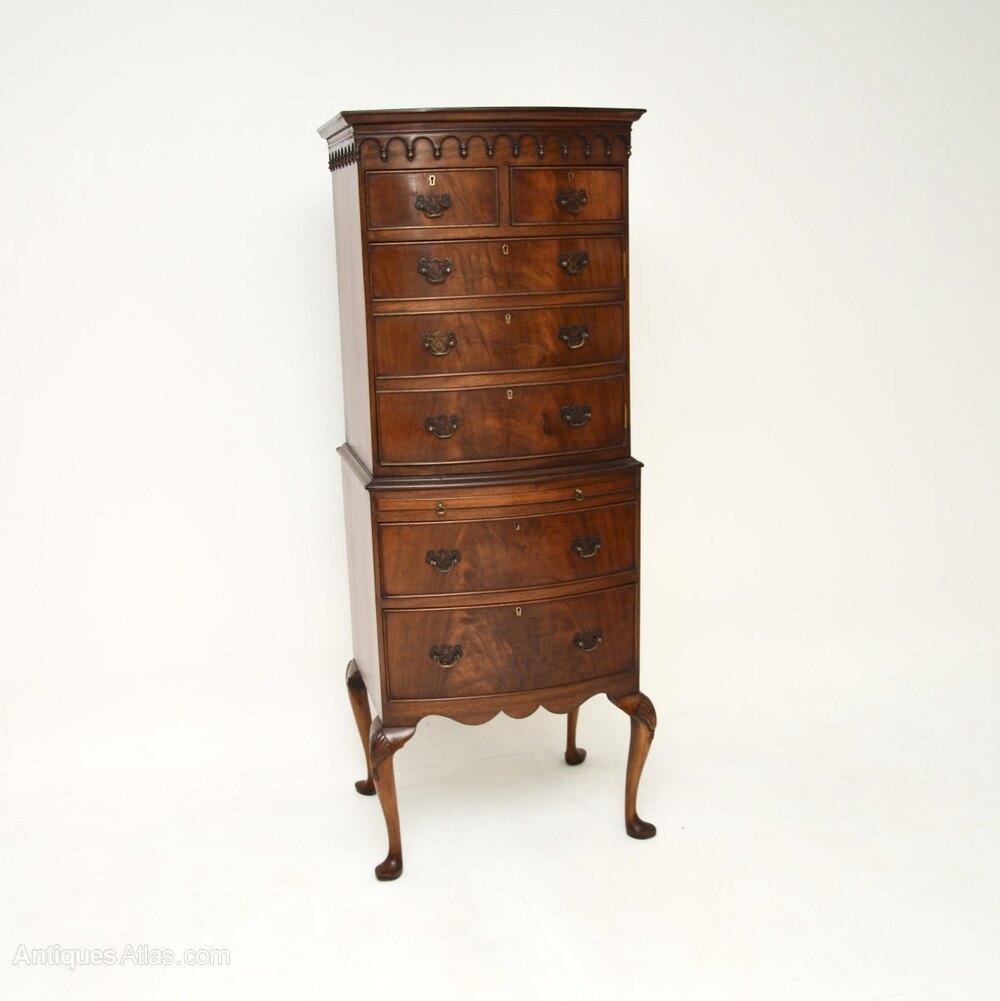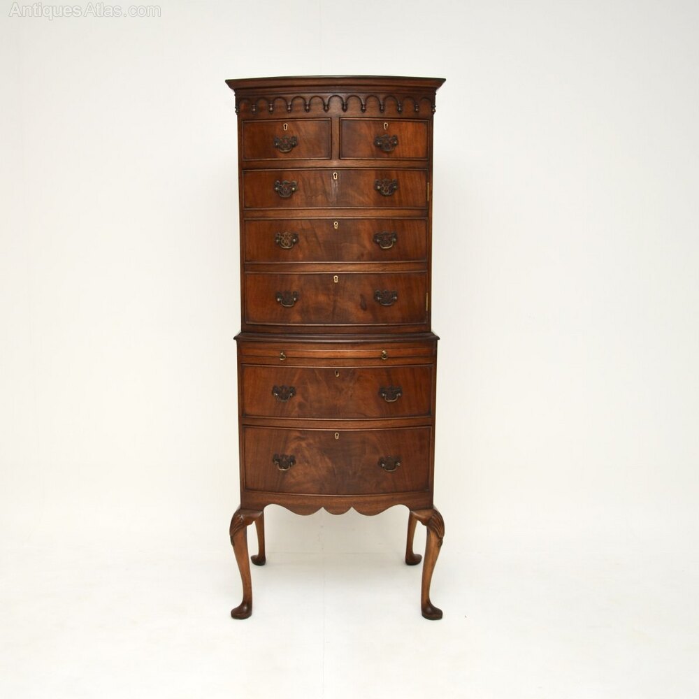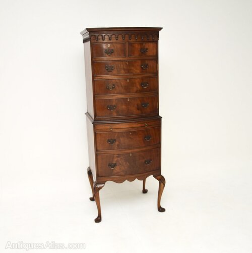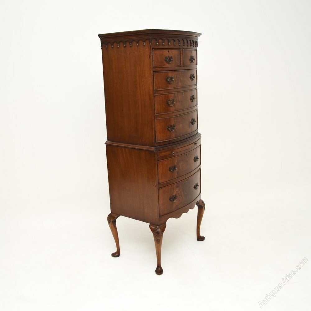 A fantastic antique mahogany cabinet / chest on legs. This was made in England, it dates from around the 1900-1910 period.It has a stylish and elegant design, the quality is outstanding. This looks like a regular chest on chest, but three of the upper drawers are actually dummy drawers that open as a door to reveal a cabinet space. There is a pull out slide below the cabinet, so this would be great as a drinks cabinet, or as a bedroom storage piece. The cornice has lovely teardrop moulding, this stands on cabriole legs with shell carving at the knees. The top half lifts off the bottom half for ease of transport.