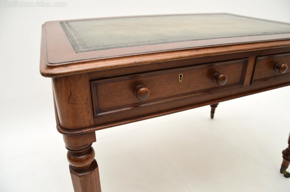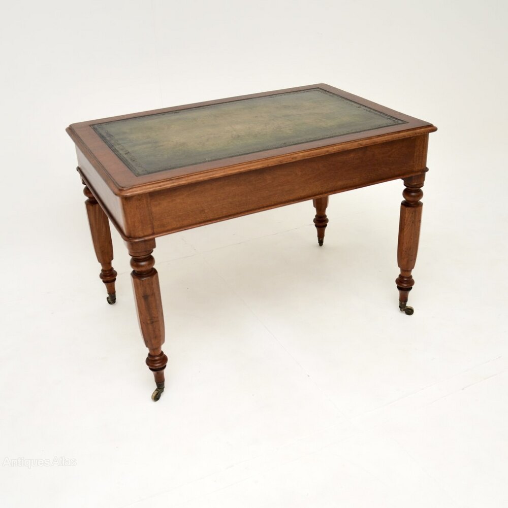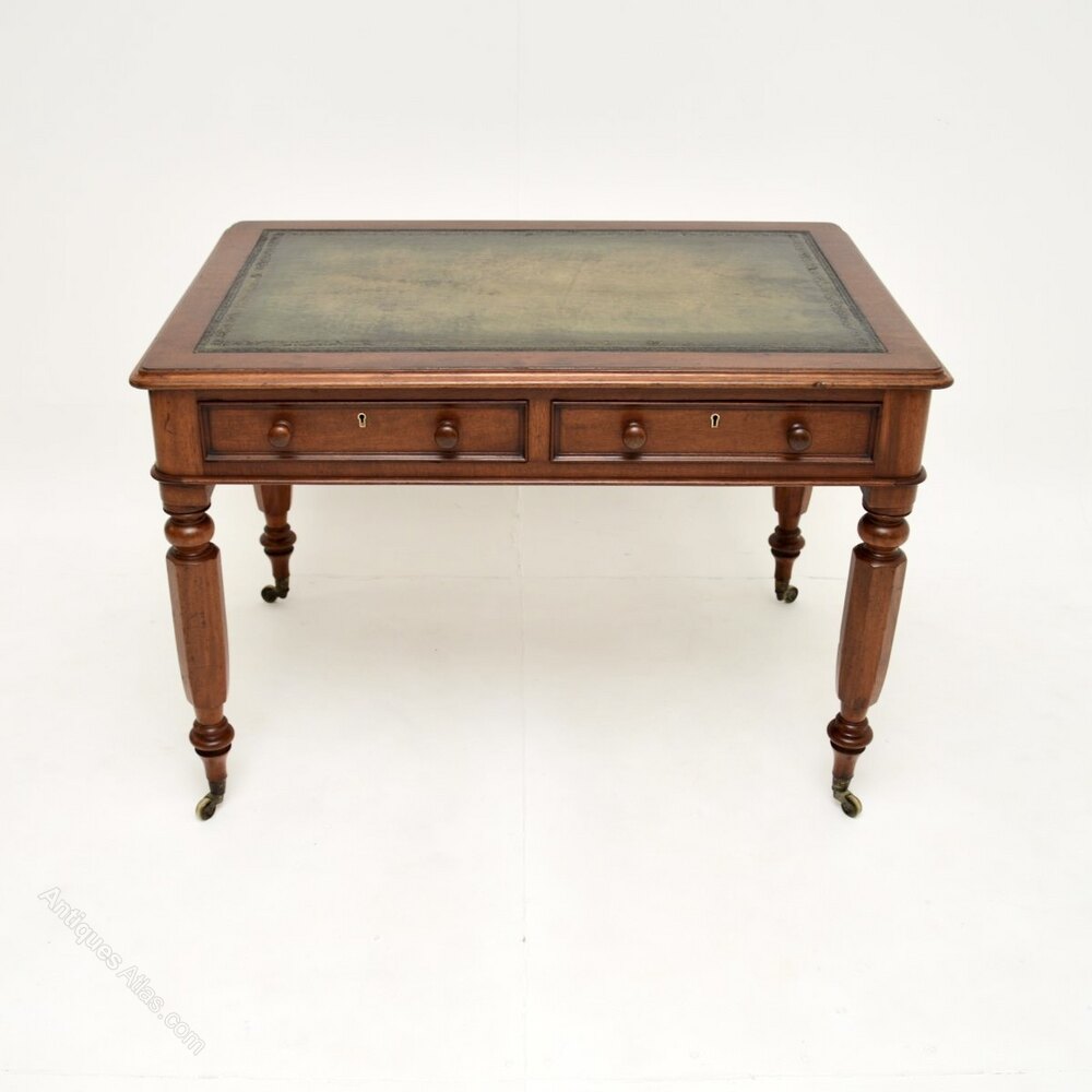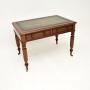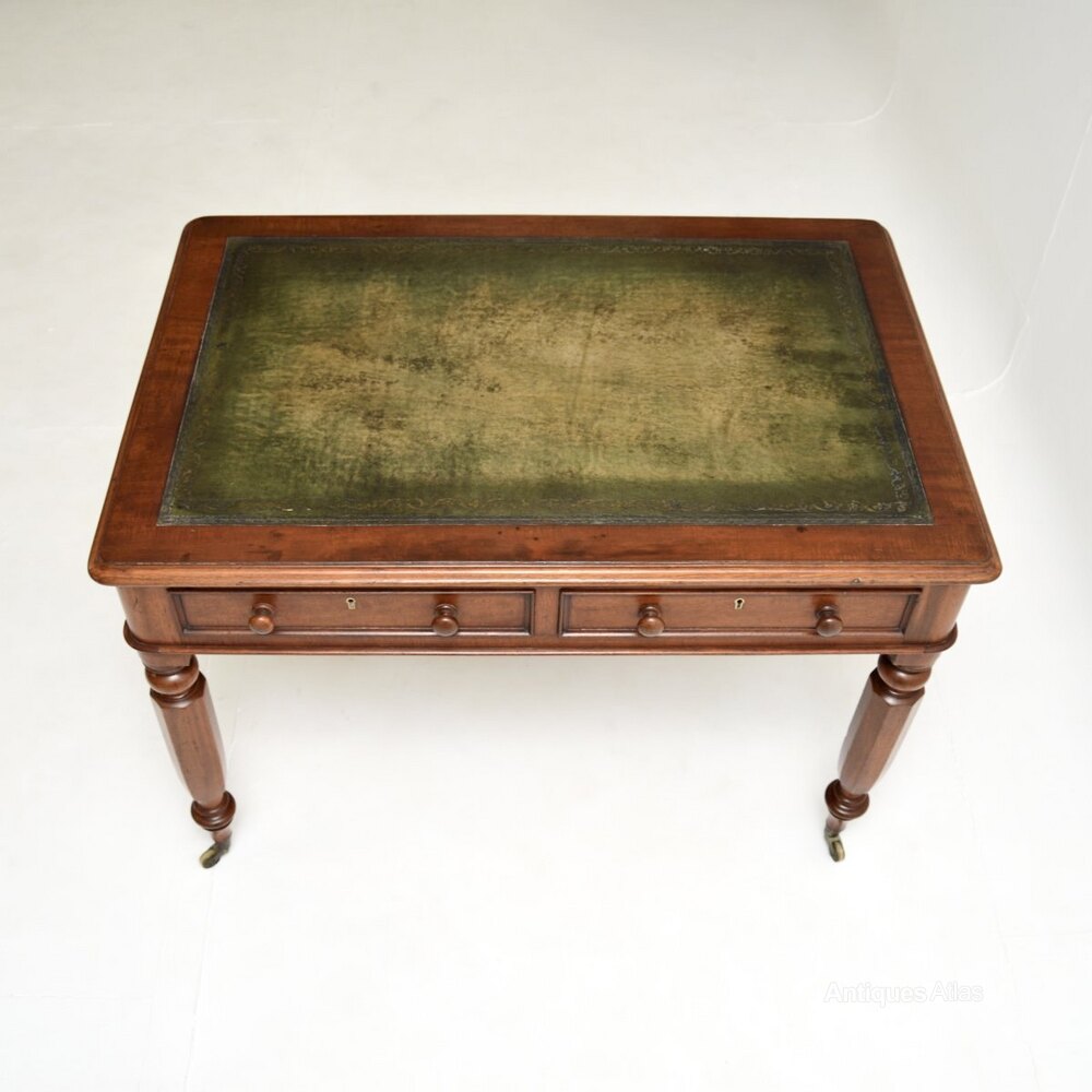 A smart and very well made antique William IV mahogany leather top desk / writing table. This was made in England, it dates from around the 1830-1840 period.This is of wonderful quality, it sits on beautifully turned solid mahogany legs terminating in brass casters. The two drawers also have beautifully turned mahogany handles and fine, hand cut dovetailed joints. The inset leather top is hand coloured and tooled round the edges. This has a nicely finished back so can be used as a free standing item.