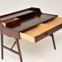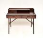 An absolutely stunning vintage Danish rosewood desk by Arne Wahl Iversen. It was made in Denmark by Vinde Mobelfabrik, it dates from the 1960’s.The quality is outstanding, this has beautiful and very practical design. The rosewood grain patterns and colour tones are gorgeous, this is nicely finished on the back so can be used as a free standing item. It has an amazing profile and looks fantastic from all angles. There are two useful drawers beneath the top, and a smaller drawer in the top section, with an open divider on the upper side. The beautifully tapered legs have nicely shaped stretchers connecting them.
