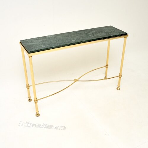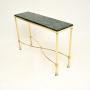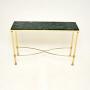 A fantastic vintage French brass and marble console table, dating from the 1970’s.It is of great quality with a very stylish design. The brass frame is nicely finished on both sides, so this can be used as a free standing item. We have had the green marble top newly made for this, the colours are absolutely gorgeous and it compliments the frame beautifully.