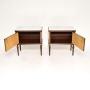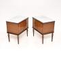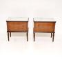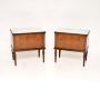 A stunning pair of vintage Italian marble top bedside cabinets, dating from the 1950’s.They are of superb quality and are a very useful size. They are made from a combination of inlaid walnut and satin wood, with the walnut being set in gorgeous geometric designs. They stand on turned and fluted legs, each has a removable single shelf inside.