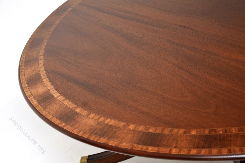 An outstanding large circular antique inlaid mahogany dining table. This was made in England, it dates from around the 1950’s.It is of superb quality and this is a beautifully elegant model, comfortably seating eight people. The solid mahogany top has stunning flame mahogany grain patterns and cross banded edges, the top can be removed for ease of transport. This sits on a splayed solid mahogany platform base which is supported by four beautifully turned baluster columns. The legs have brass feet caps and casters.