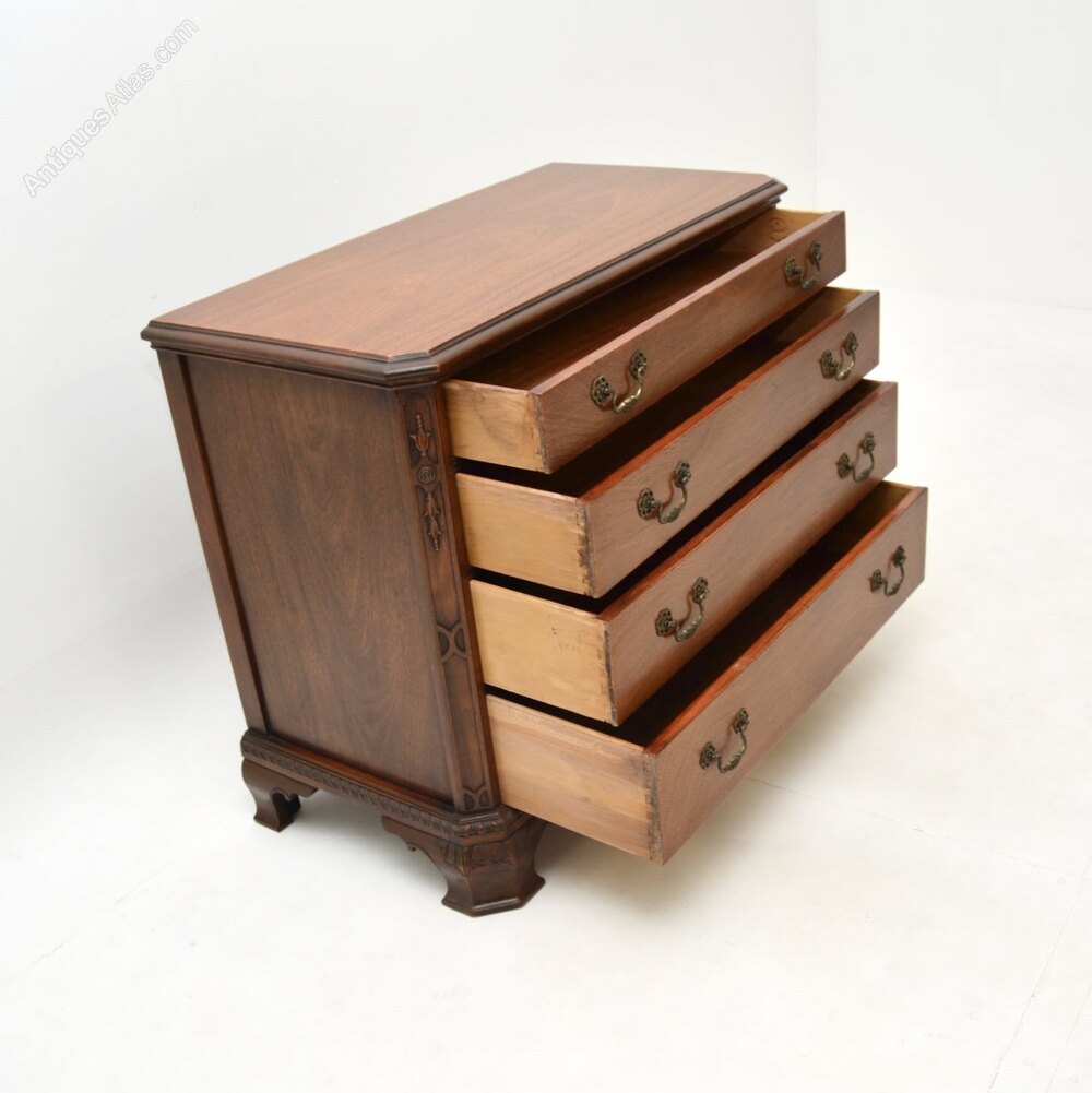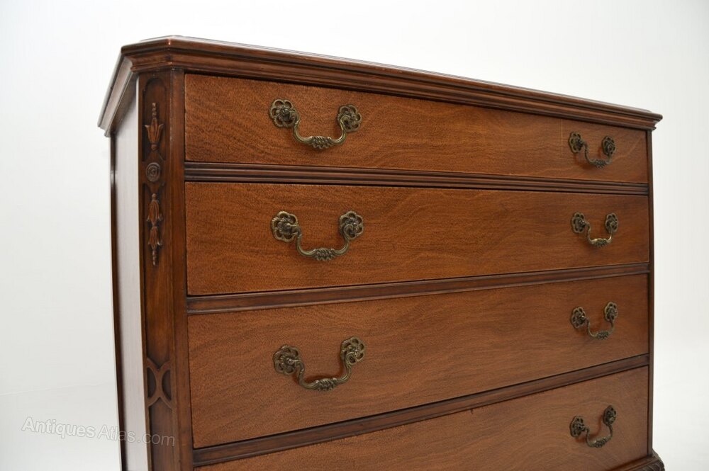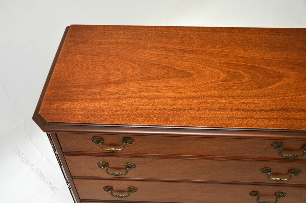 An impressive and extremely well made antique Georgian style mahogany chest of drawers. This was made in the USA by Drexel, it dates from around the 1960’s.It is of superb quality, it is a great looking and very functional item, with lots of storage space in the generous drawers. There is fine carving around the edges and intricate pierced brass handles on the drawers, this stands on bold ogee bracket feet.