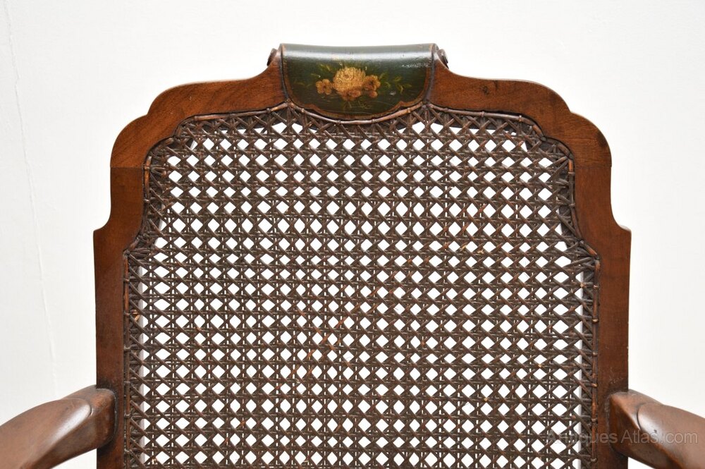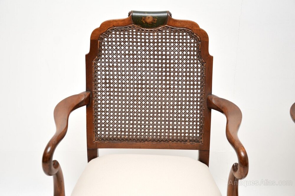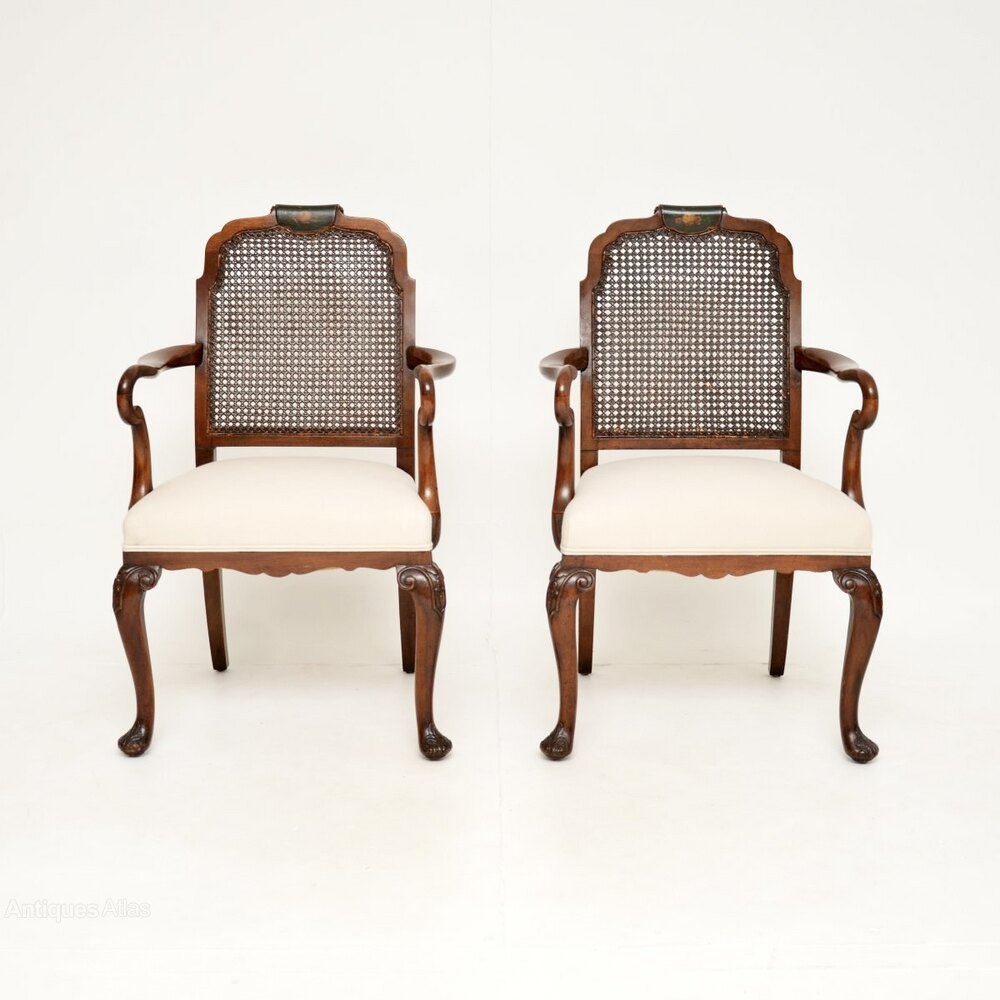 A beautiful pair of antique Edwardian lacquered walnut and cane armchairs. They were made in England, they date from around the 1900-1910 period.The quality is superb, they have a gorgeous design in the Queen Anne style. The solid walnut frames have caned backs with lacquered decorations at the top of the back rests. They have shepherds crook arms, and stand on cabriole legs with carving at the knees and feet.
