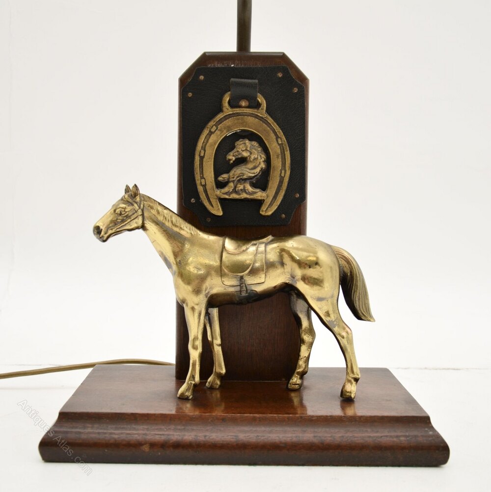 A beautifully made antique brass and oak equestrian table lamp. This was made in England, it dates from around the 1920-30’s.It is quite large and is of excellent quality. The oak upright also has a lovely leather and brass horseshoe mount. This has the original decorative shade, everything is very good overall condition, with just some minor surface wear.