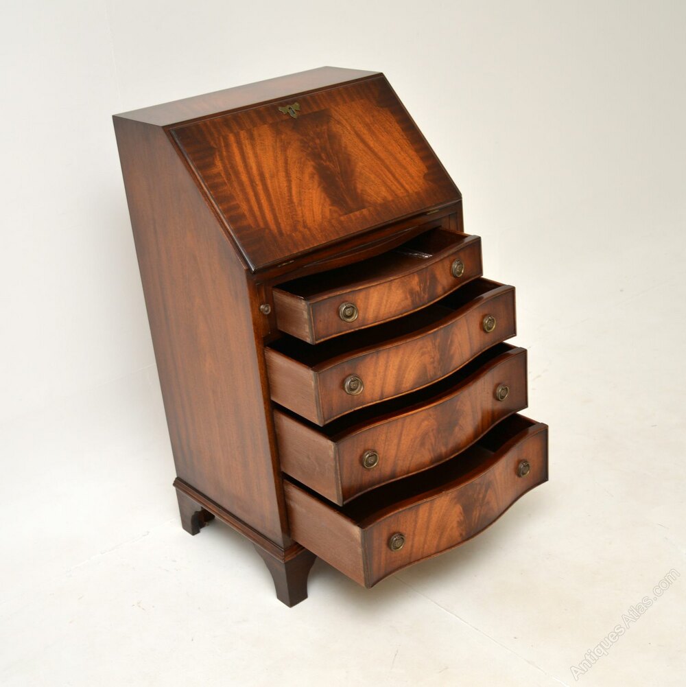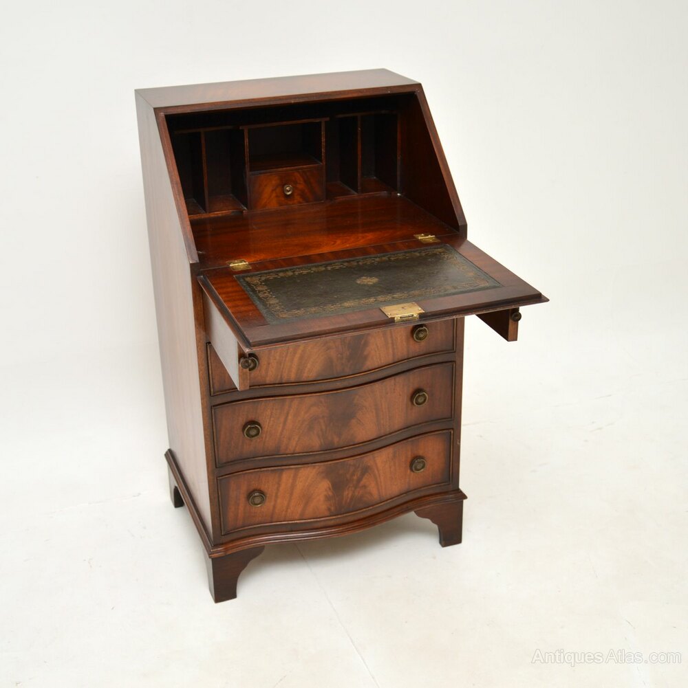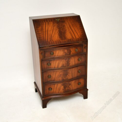A smart and useful antique Georgian style mahogany writing bureau. This was made in England, it dates from around the 1950’s.The quality is fantastic, this is beautifully designed with a compact and very practical design. There is a good size work space when the writing flap is pulled down, there is also lots of storage space in the lower drawers. This has lovely brass handles, it sits on bracket feet and has a serpentine shaped front.