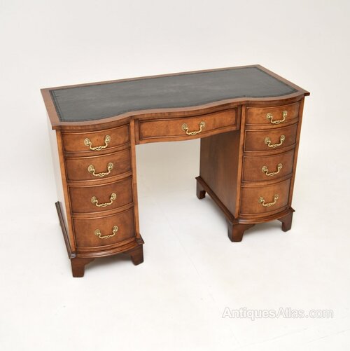 A fantastic antique burr walnut leather top pedestal desk. This is in the Georgian style, it dates from around the 1930’s.The quality is superb, this has a beautiful inset leather writing surface with tooled edges. There are amazing burr walnut grain patterns throughout including the back, which is nicely finished so this can be used as a free standing item. This has a serpentine shaped front, it sits on bracket feet and contains lots of storage space inside the generous drawers.