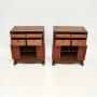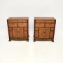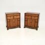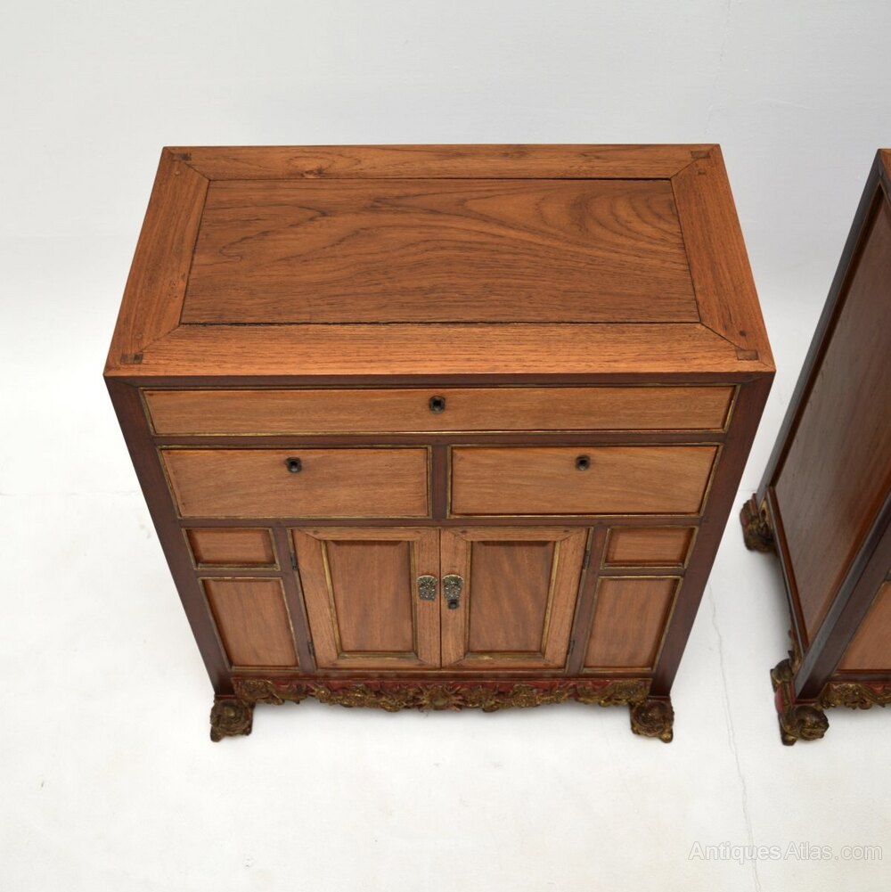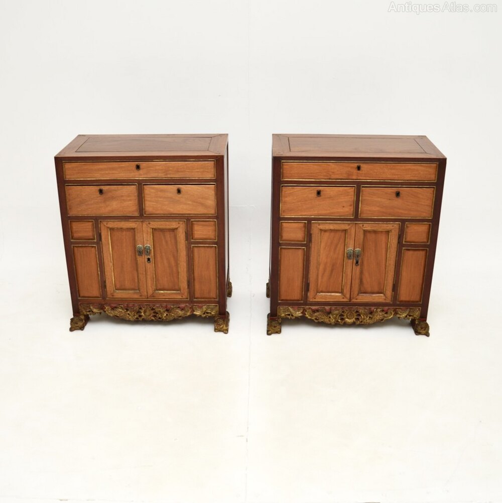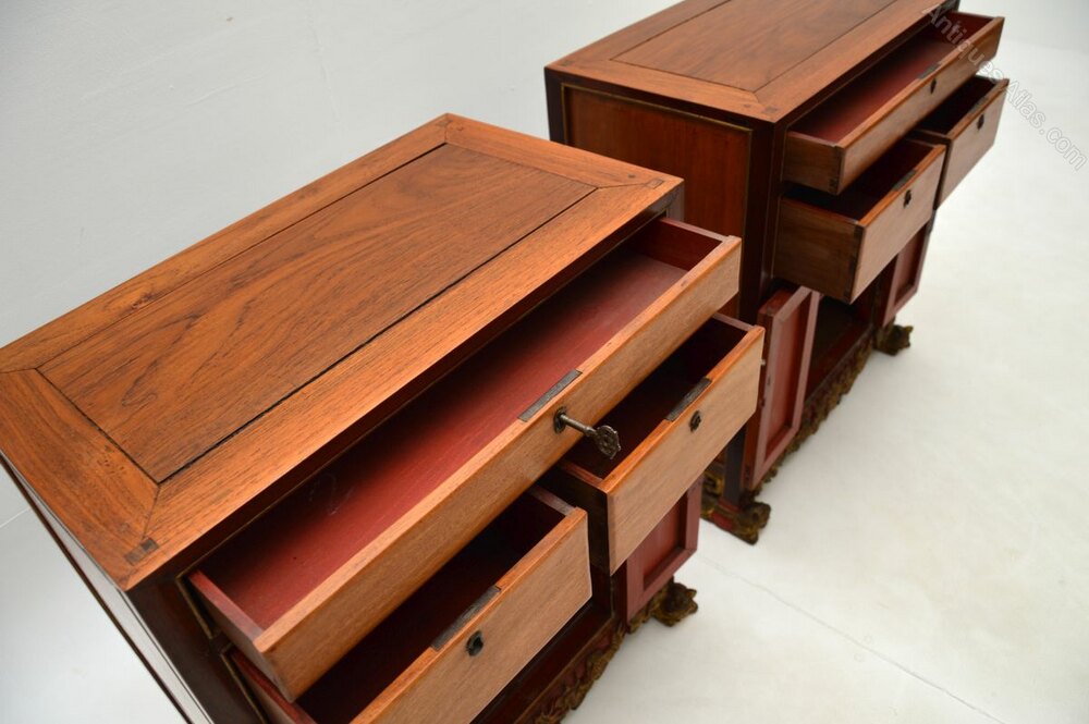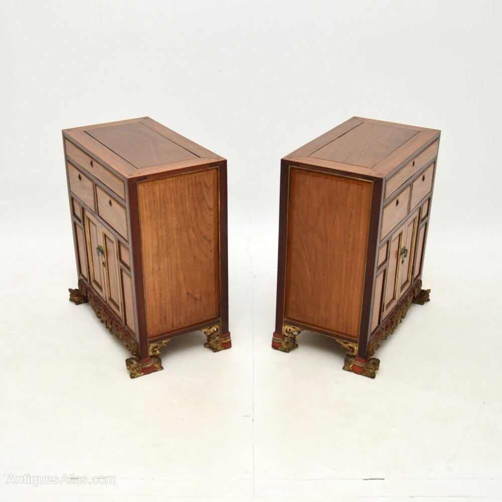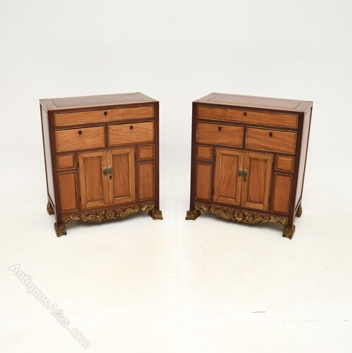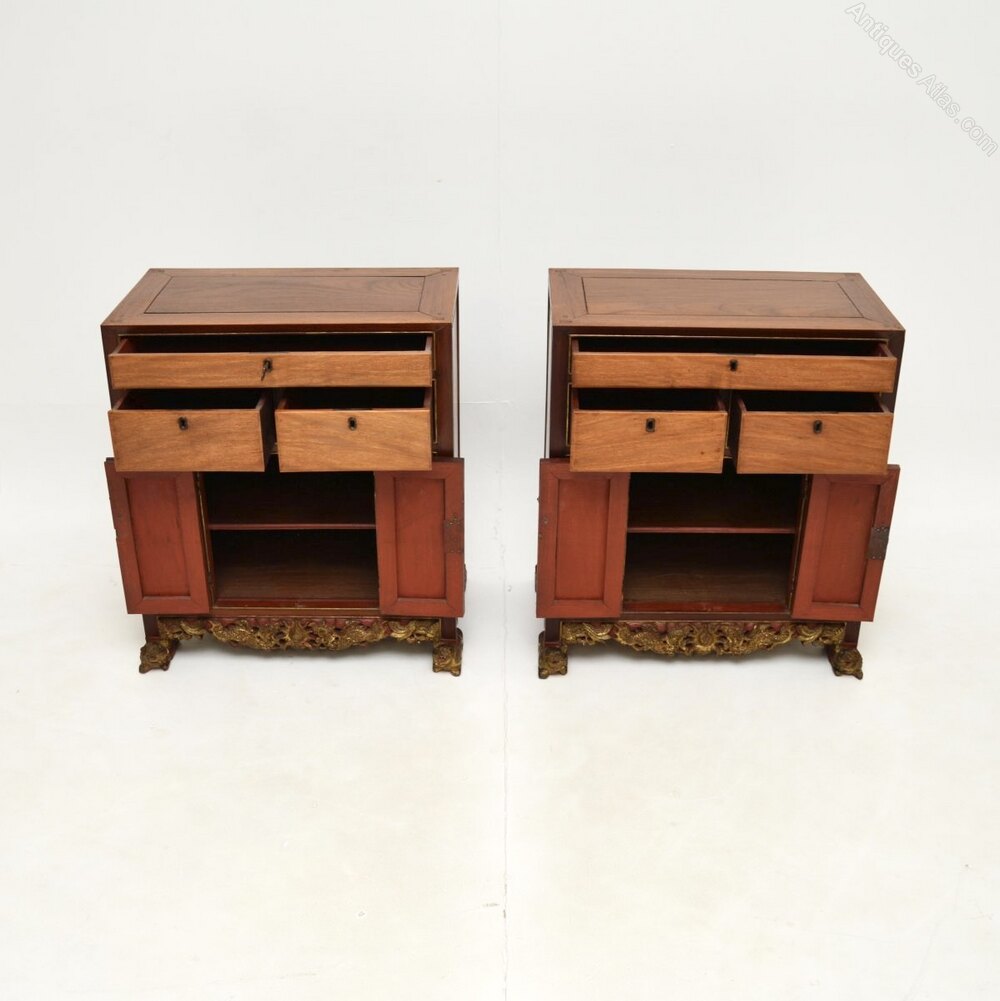 A wonderful pair of antique Chinese hardwood bedside / side cabinets. They were made in China and likely date from around the 1890-1910 period.They are very well made and are a very useful size, perfect for use as bedside cabinets or side cabinets around the home. They are beautifully designed, they stand on amazing carved bases with ornate dragon shaped feet.