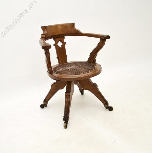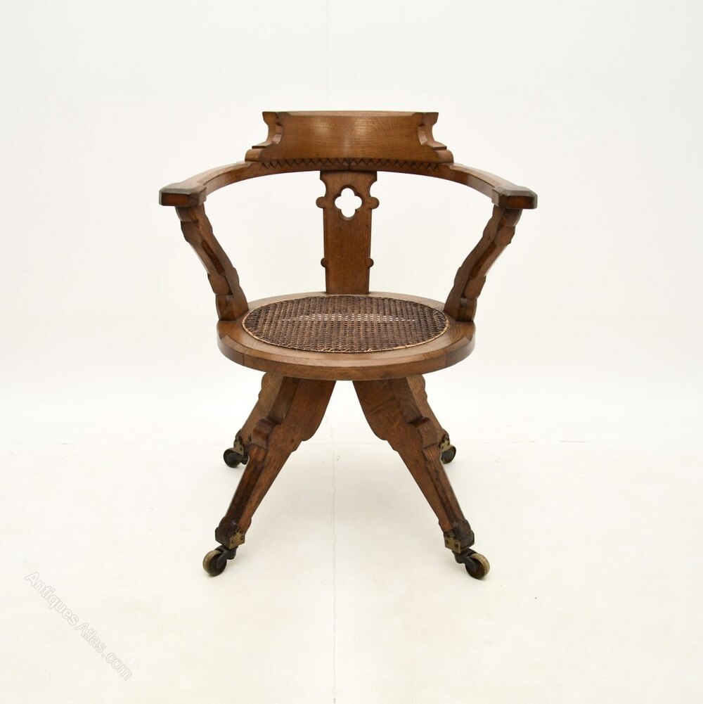 A superb antique Victorian Gothic revival solid oak swivel desk chair, made in England and dating from around the 1870-1880 period.This is of outstanding quality, it is beautifully crafted and is extremely comfortable. The solid oak has a gorgeous colour tone and wonderful grain patterns. It has a lovely rounded shape with a pierced back, and canted edges on the arm rests and legs The round seat is beautifully caned. This swivels smoothly and rolls on original casters. The mechanism is extremely well made and is in good working order.