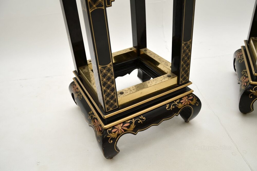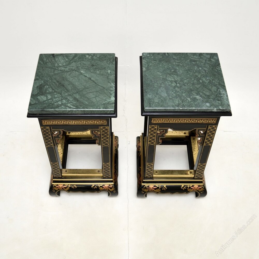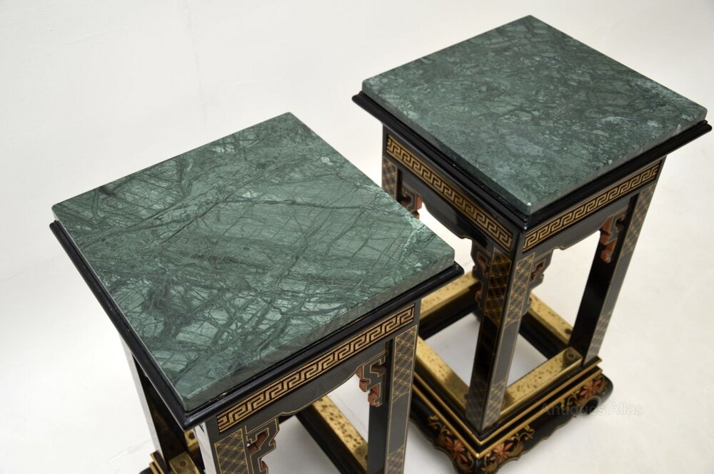 A stunning pair of antique lacquered chinoiserie marble top side tables. They were likely made in England in the oriental style, they date from around the 1950’s.The quality is superb, they are beautifully designed and are a very useful size. The black lacquered and gold embellished finish is full of character and charm, they have lovely green marble tops that sit loose on the frames. There are wooden blocks under the marble tops that stop them from sliding off.