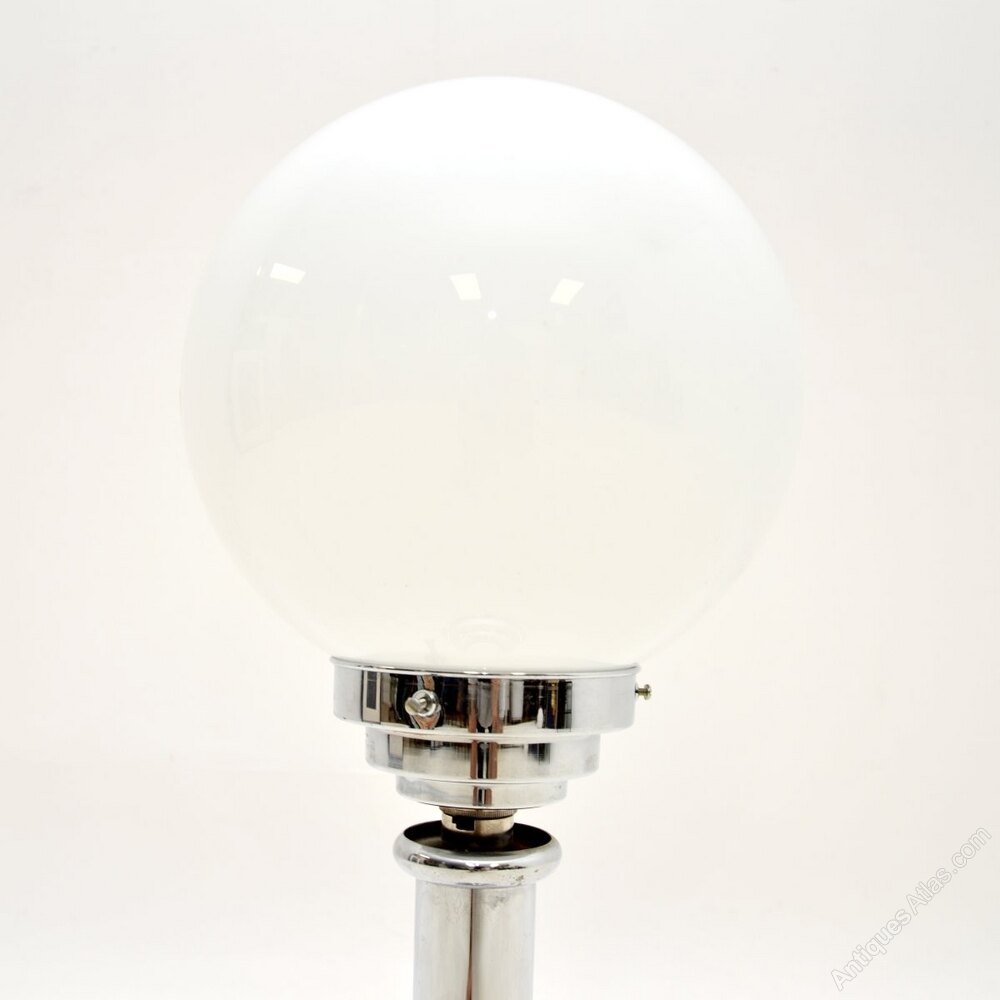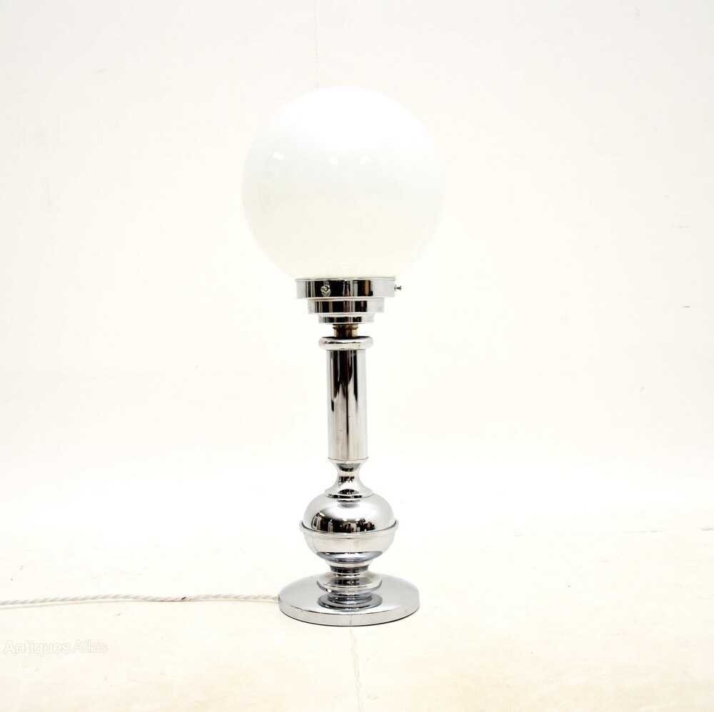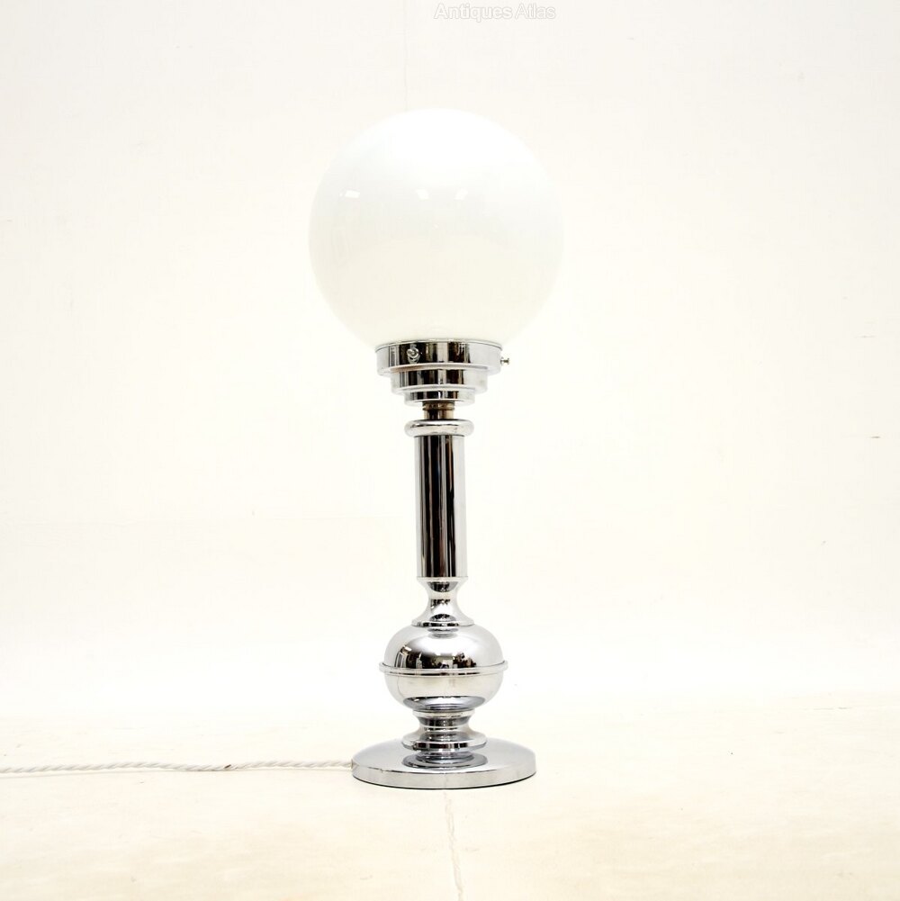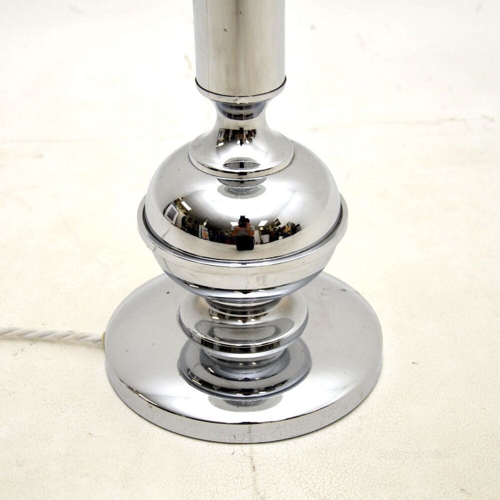 A stylish and very well made Art Deco chrome and glass table lamp, made in England and dating from around the 1930’s.This is of superb quality, it is quite large and very impressive. The chrome frame is beautifully designed, it supports an opaline glass shade that can be easily removed by unscrewing three bolts.